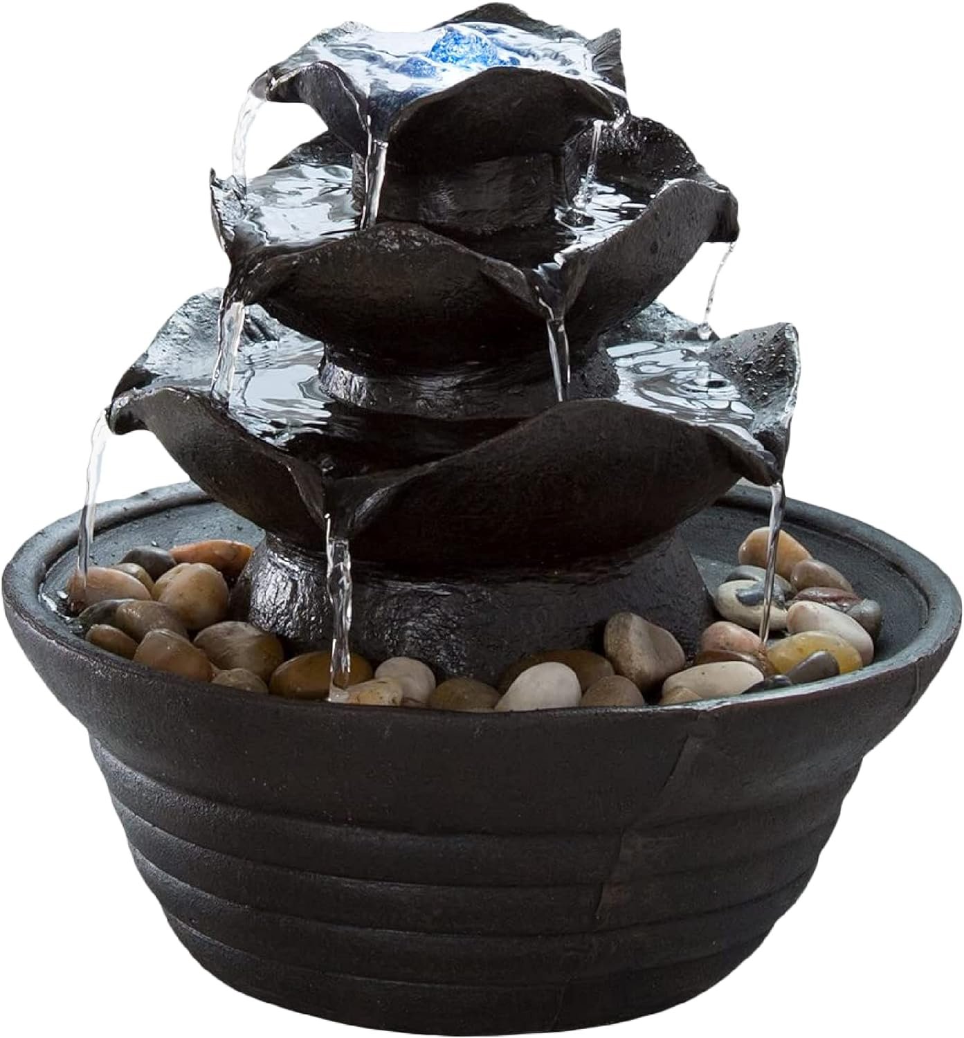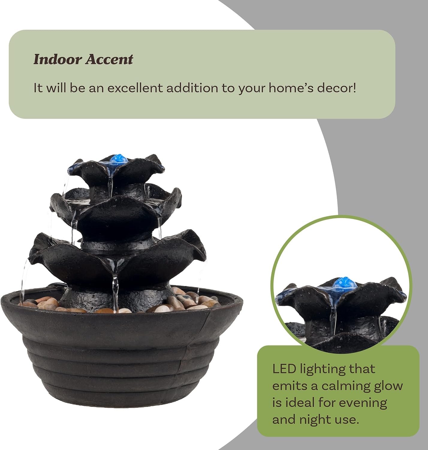 TABLETOP FOUNTAIN – This LED-lit 3-tiered waterfall fountain is a blend of modern design, Zen elements, and natural charm. The tranquil, meditative sound of cascading water is sure to bring a calming ambiance to your bedroom, living room, or office.