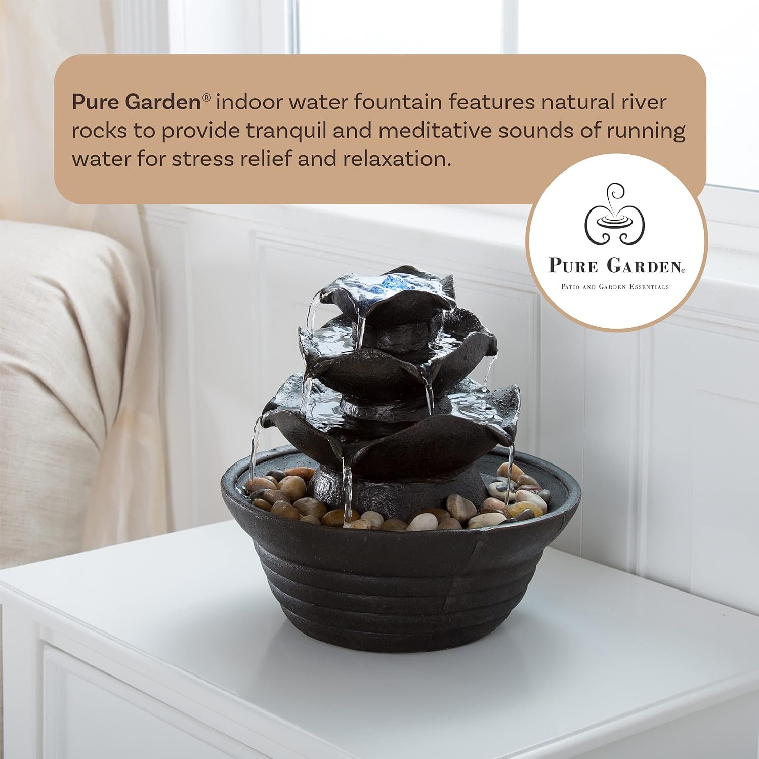 The soothing water sounds, contemporary look, and lighting ambiance of the 3-Tiered Mini Fountain by Pure Garden will bring tranquility, relaxation, and modern beauty to your living or working area. The indoor waterfall features a polyresin construction for durability, LED lights, and a pump with a maximum flow of 47-gallons-per-hour. Whether you use this desk fountain as decoration in your office or on a tabletop in your home, this lighted waterfall fountain is sure to bring an environment of peace and serenity, while leaving an elegant lasting impression. IMPORTANT: Pure Garden is committed to providing the consumer with the absolute best price and value on all of our products. NOTE: This is an exclusive product of Pure Garden and ONLY Indoor Water Fountains by Pure Garden are GUARANTEED to be genuine. Avoid buying counterfeit products and transacting with unauthorized sellers.