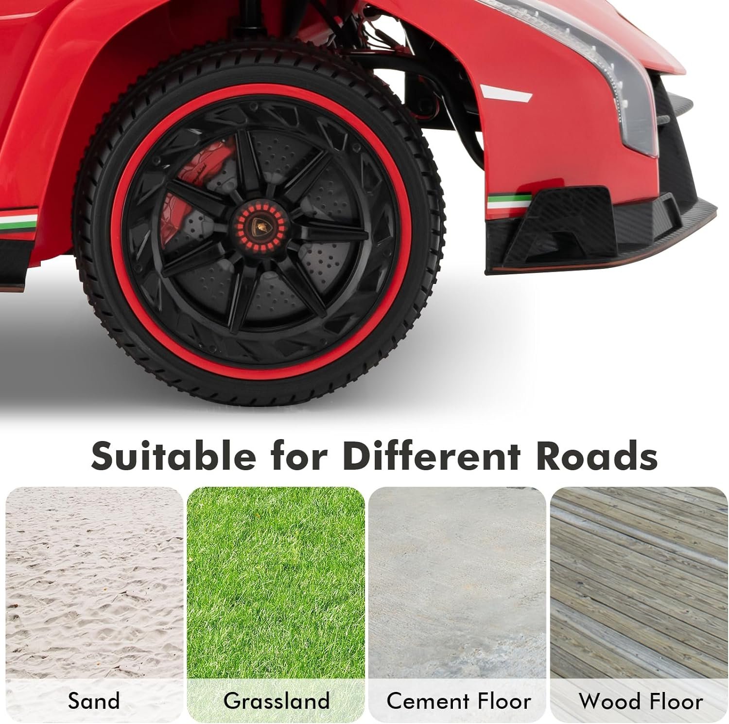🏎️Licensed Lamborghini: INFANS kids car with the official Lamborghini veneno appearance features a sleek and streamlined design. It is equipped with a cool rear wing and LED taillights to give child a real riding experience. Doors with hydraulic rods open like a real Lamborghini.