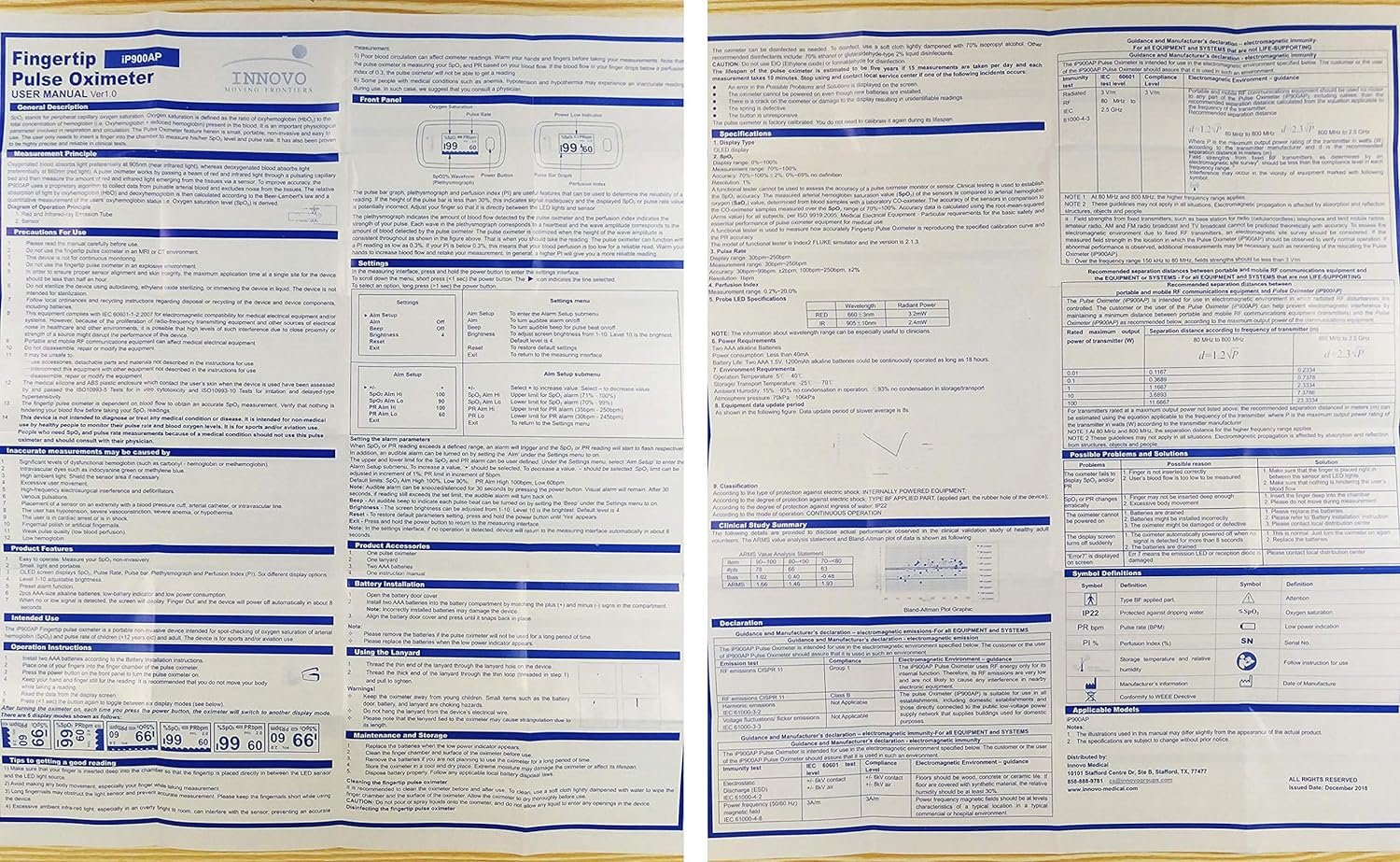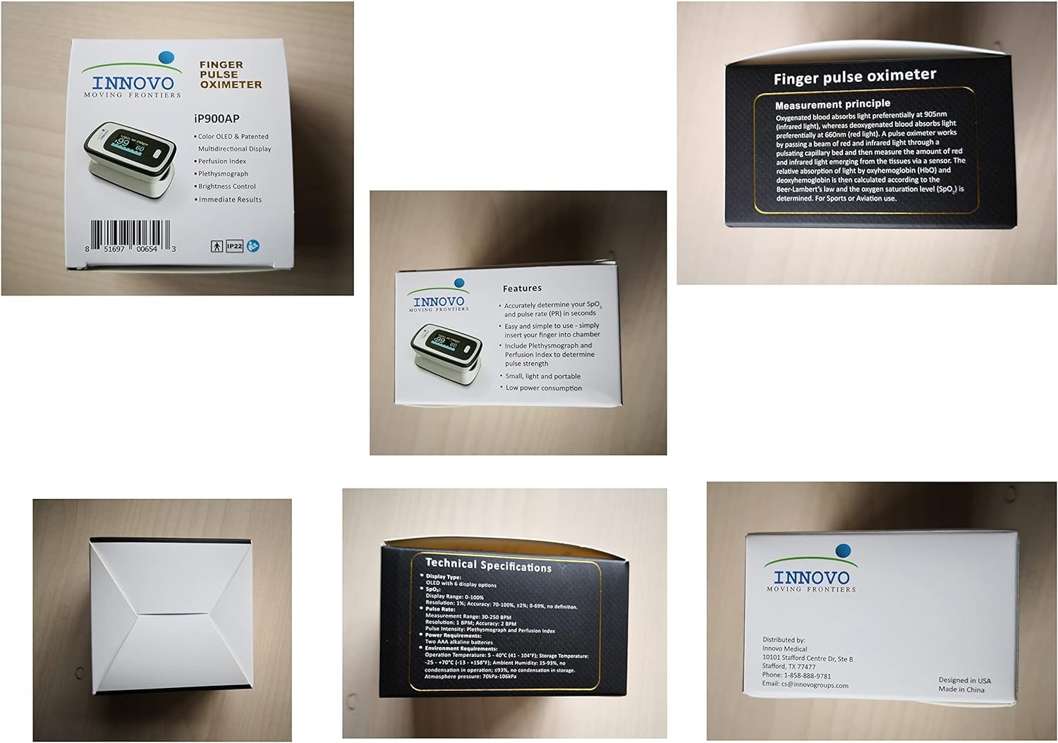 The Innovo Deluxe Fingertip pulse oximeter shows your measured SpO2 and Pulse Rate on a high quality OLED screen (with six multidirectional display choices) and come with two critically acclaimed features, the Plethysmograph and Perfusion Index (PI), that will improve the reliability of the readings dramatically. Each wave corresponds to a heartbeat and the amplitude to the amount of blood detected in your blood vessels. When the height of the wave amplitude no longer fluctuates (as shown like the figure above), this means that the pulse oximeter is now optimized and you may now take the readings. Meanwhile, the PI conveniently informs you of the strength of your pulse. If the PI value is less than 0.2%, this means that your hands are too cold or improperly positioned in the pulse oximeter. Simply warm your finger and reposition it so that it is right under the LED lights. No more second guessing if the readings are reliable or why the pulse oximeter is not giving a reading. Using a vastly improved sensor, the Innovo deluxe pulse oximeter can also now correct for small movements, allowing more versatile usage. Comes with a lanyard and 2 AAA batteries so that you can use the pulse oximeter right out of the box. The oximeter might not work on kids or adults with small fingers. Innovo is a registered trademark of USPTO. We will actively and aggressively pursue any parties who infringe on our intellectual property rights to the maximum extent allowed by the law. Beware of Imitation, Buy Original. Innovo Pulse Oximeter is designed in USA.