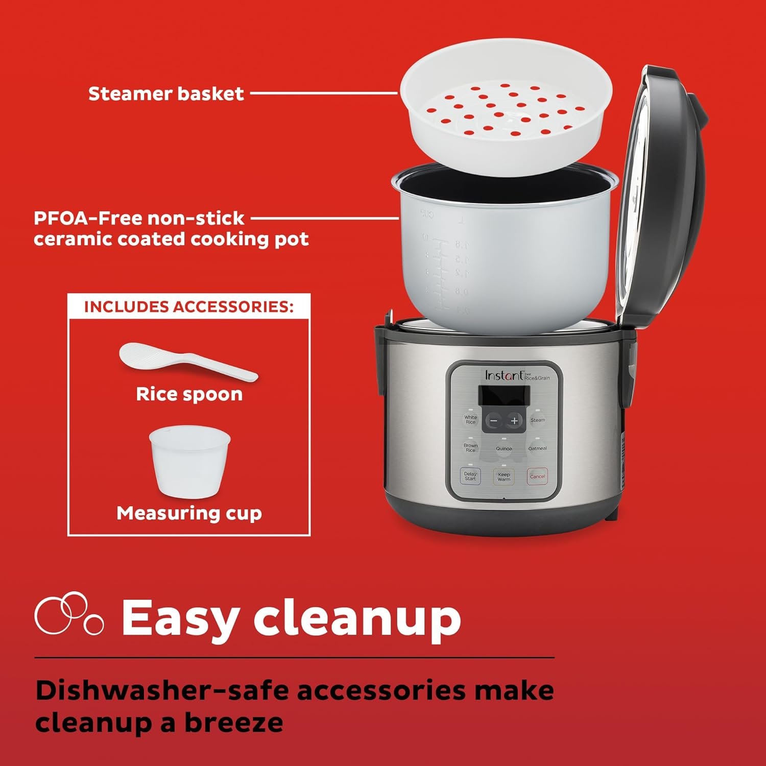 ACCESSORIES INCLUDED: In addition to the non-stick ceramic coated pot, the Zest Plus also comes with a dishwasher-safe steamer tray, rice measuring cup and rice spoon.