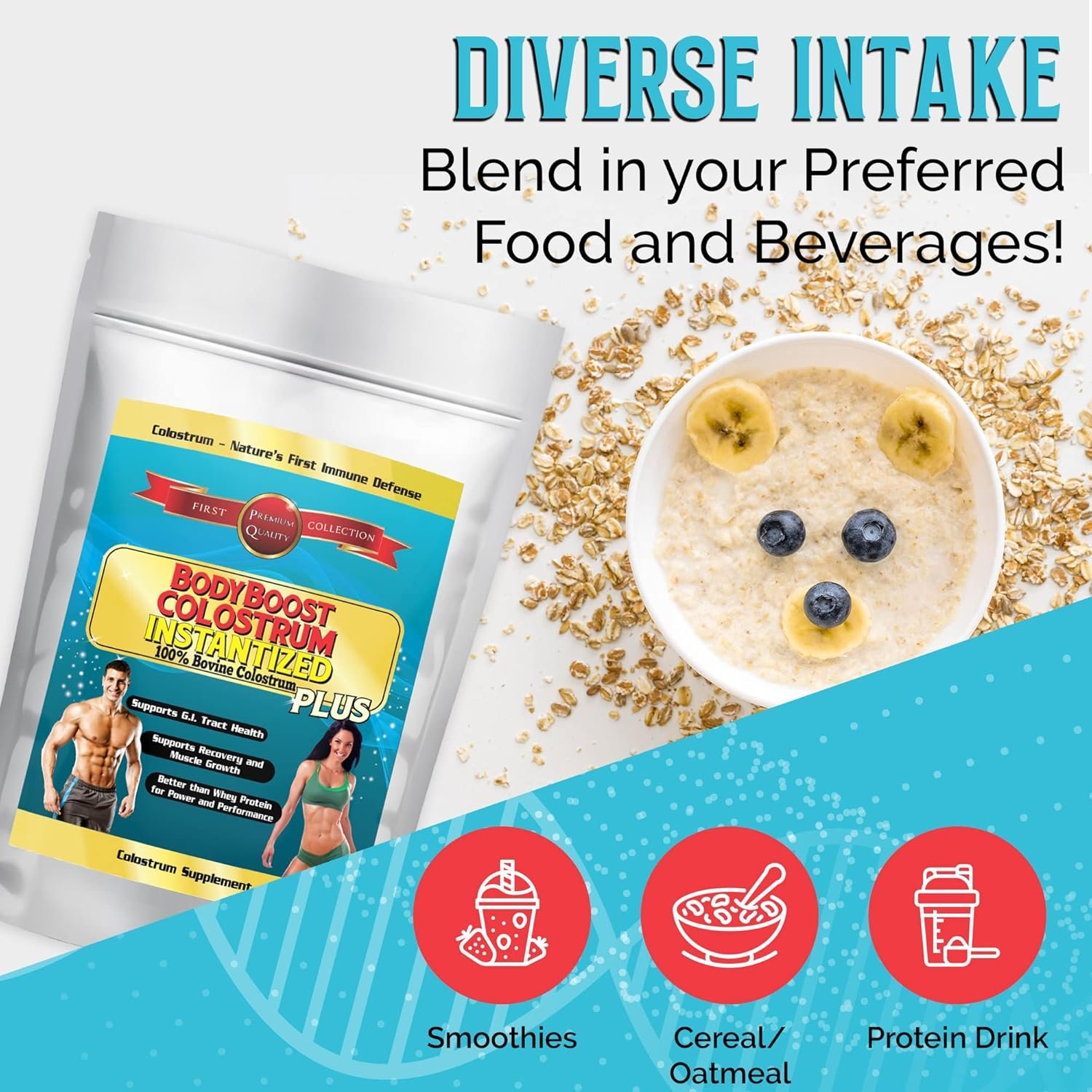 【 NATURAL & SAFE 】: Body Boost Colostrum is a safe and healthy option as it is non-GMO and hormone-free. It is sourced from Grade A dairies and grass-fed cows, which produce high-quality milk with lower unhealthy fats & higher nutrients. The supplement is carefully processed to retain its potency and effectiveness for supporting immune function, gut health, muscle growth, & overall well-being.