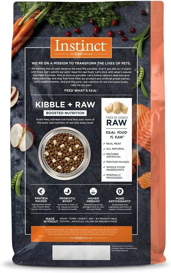 GRAIN FREE DOG FOOD WITH FREEZE DRIED RAW: Instinct Raw Boost natural dry dog food combines high protein, grain free salmon kibble with all natural bites of freeze dried raw USA Raised beef. Wild caught salmon is the #1 ingredient. Poultry free recipe.