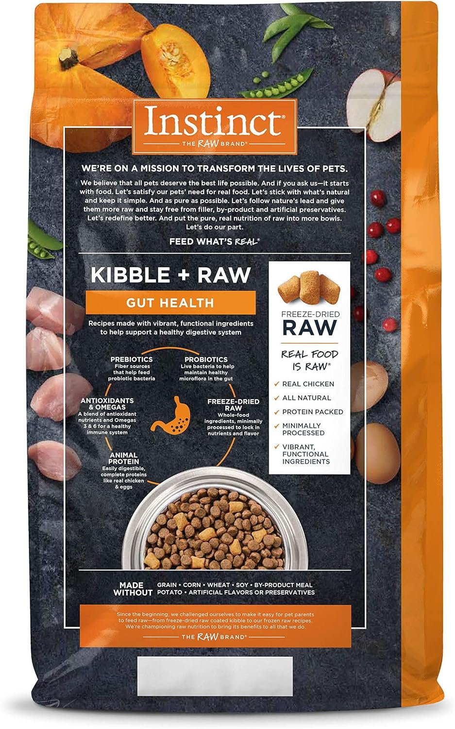 GRAIN FREE DOG FOOD WITH FREEZE DRIED RAW FOR GUT HEALTH: Instinct Raw Boost dry dog food combines high protein, grain free kibble with natural bites of freeze dried raw. Cage free chicken is the #1 ingredient plus all natural, functional ingredients.