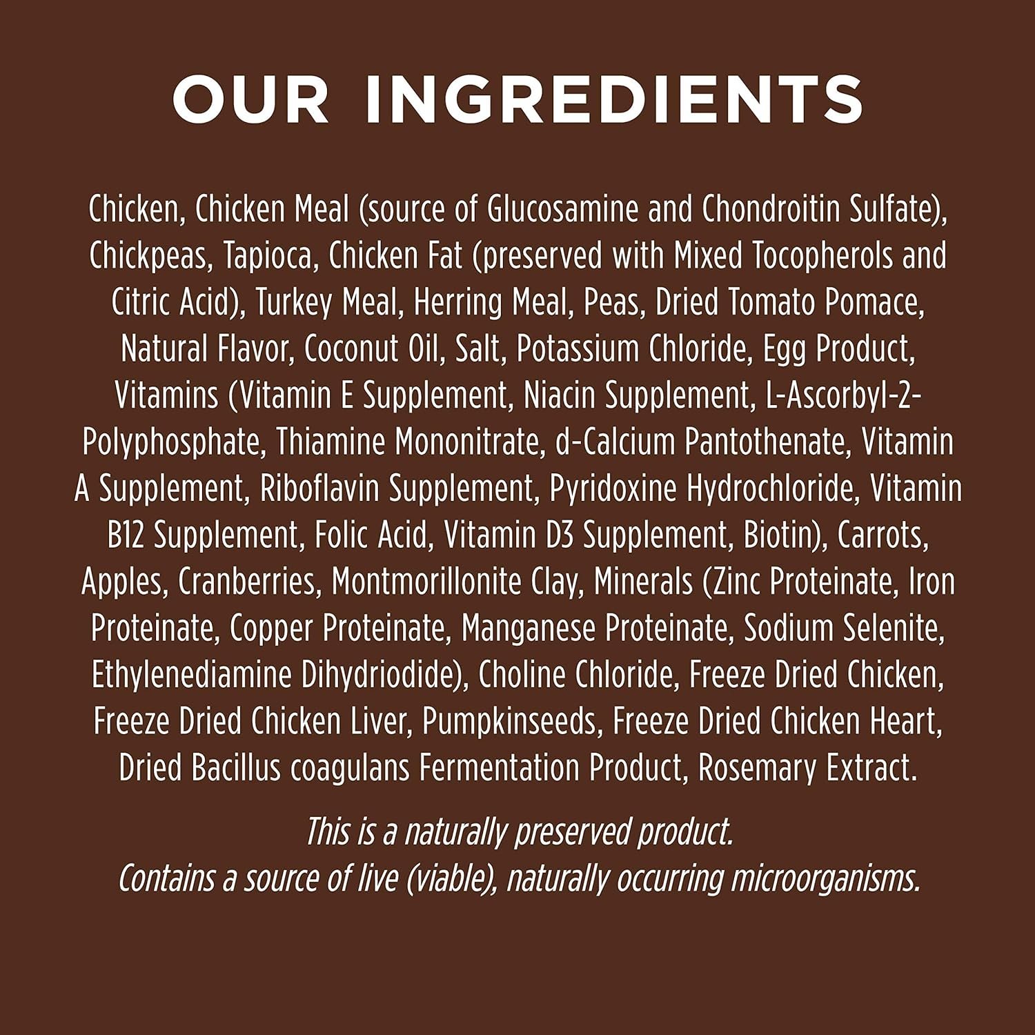 Chicken, Chicken Meal (source of Glucosamine and Chondroitin Sulfate), Chickpeas, Tapioca, Chicken Fat (preserved with Mixed Tocopherols and Citric Acid), Turkey Meal, Herring Meal, Peas, Dried Tomato Pomace, Natural Flavor, Coconut Oil, Salt, Potassium Chloride, Egg Product, Vitamins (Vitamin E Supplement, Niacin Supplement, L-Ascorbyl-2-Polyphosphate, Thiamine Mononitrate, d-Calcium Pantothenate, Vitamin A Supplement, Riboflavin Supplement, Pyridoxine Hydrochloride, Vitamin B12 Supplement, Folic Acid, Vitamin D3 Supplement, Biotin), Carrots, Apples, Cranberries, Montmorillonite Clay, Minerals (Zinc Proteinate, Iron Proteinate, Copper Proteinate, Manganese Proteinate, Sodium Selenite, Ethylenediamine Dihydriodide), Choline Chloride, Freeze Dried Chicken, Freeze Dried Chicken Liver, Pumpkinseeds, Freeze Dried Chicken Heart, Dried Bacillus coagulans Fermentation Product, Rosemary Extract