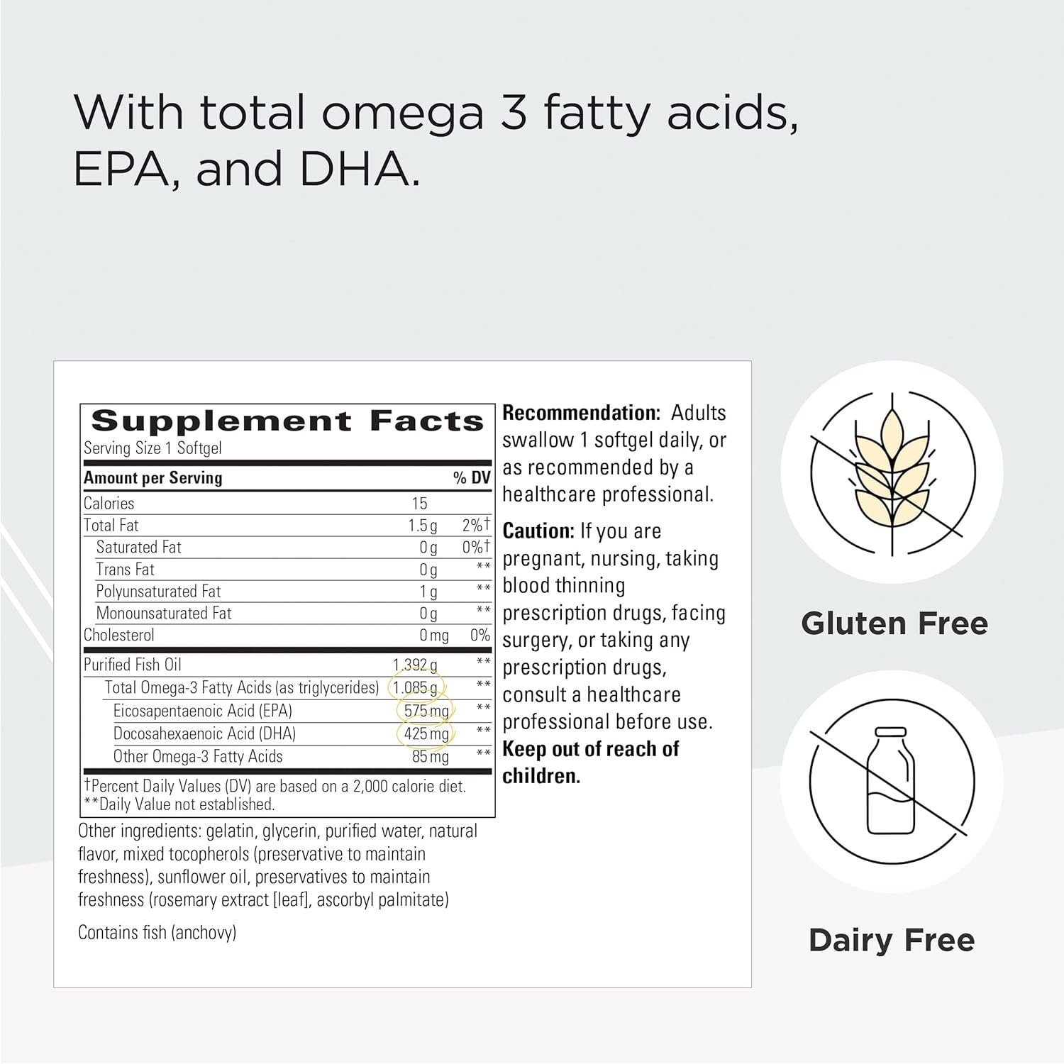 Daily Fish Oil Supplement: This DHA and EPA supplement contains no artificial flavoring, dairy, gluten, salt, or wheat