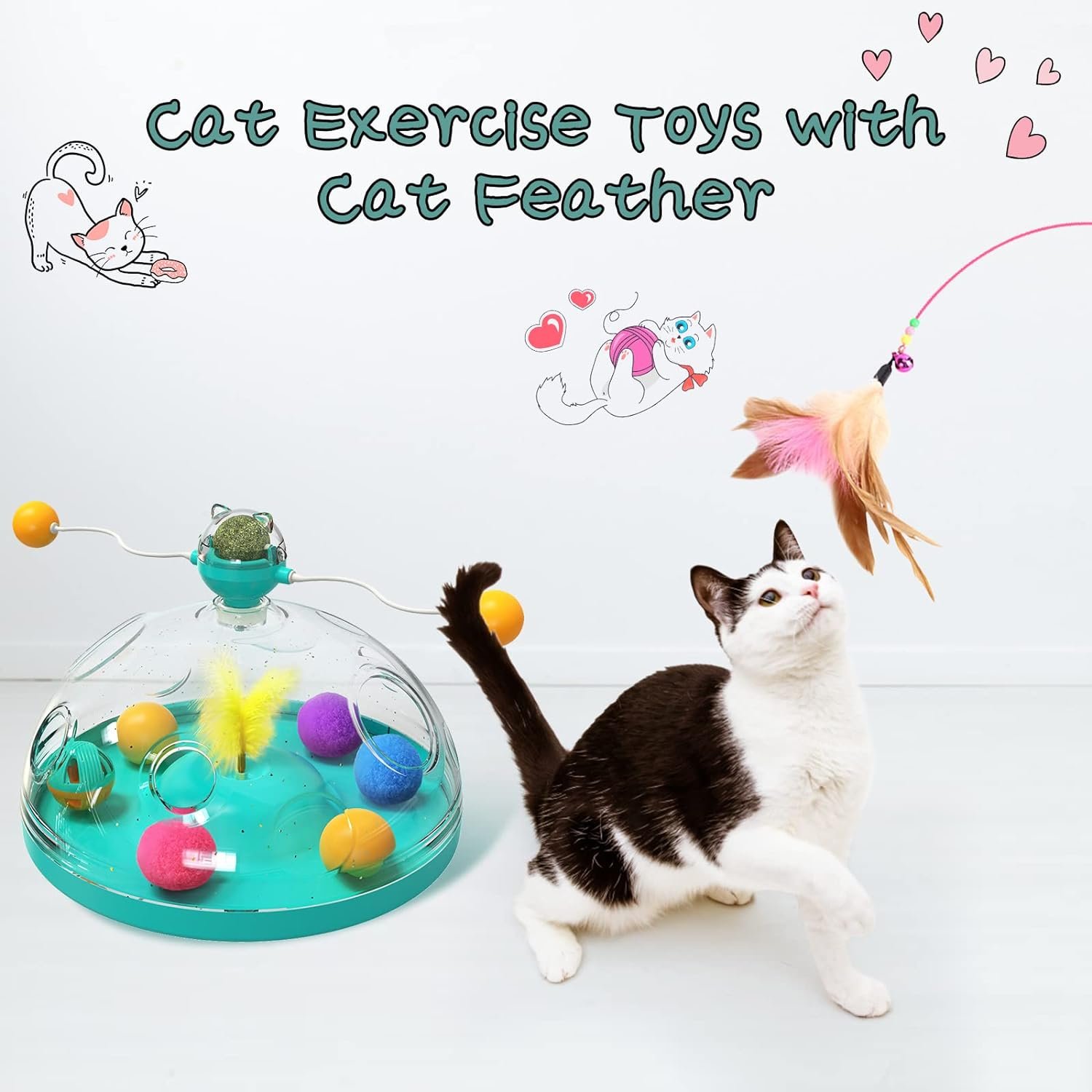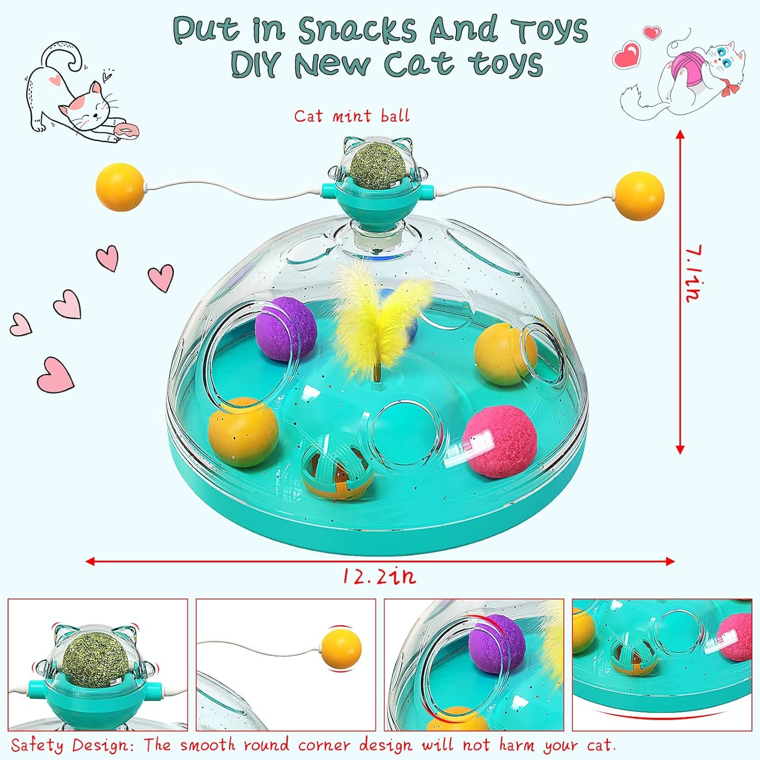 🐈5in1 Multi-Functional Cat Toy: This is a multi-functional interactive cat toy specially designed for indoor cats, which combines many kinds of fun such as rotating track ball, catnip, cat hole, feather toy, cat toy ball.we give you a cat teaser in additional,what a bargain to spend once money and get 6 cat toys.