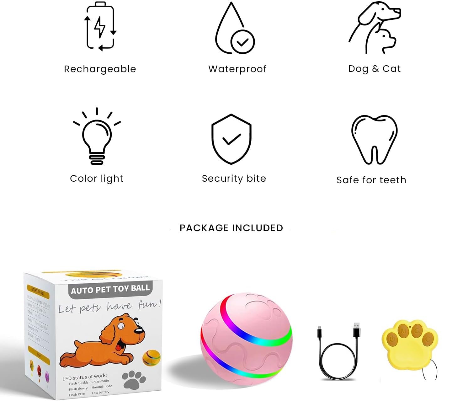 【Rich Interactive Modes】Normal Mode: Movement and rotation. Crazy Bouncing Mode: Bouncing and rotation. Colorful lights inside the ball can grab the dog’s attention. Choose mode according to its size and interest, keep your pet engaged and active.