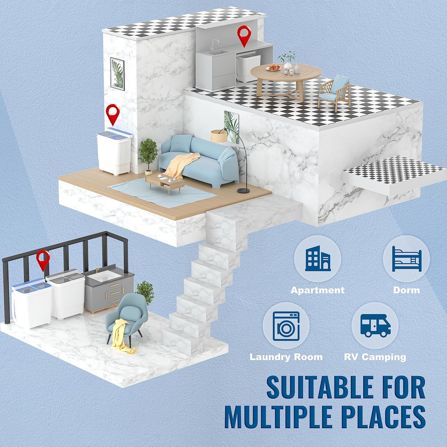 【Practical Designs】: Constructed of upgrading plastic body that make the mini washer machine for long term use, with strong drain pump + powerful motor make it for long term use. Besides, exquisite appearance and space-saving design is ideal even though in limited space!!!