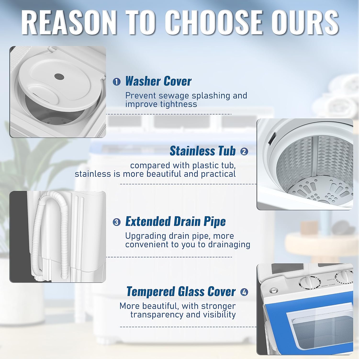 【Large Capacity and Powerful】: Mini lavadora, but large capacity. 8 lbs for washer and 7 lbs for spin tub, what’s more, the spin tub is made of stainless steel, for long term use. Also, our apartment washer with powerful motor, 280 W washing power and 160 spin power, built-in gravity drain, full free your hands