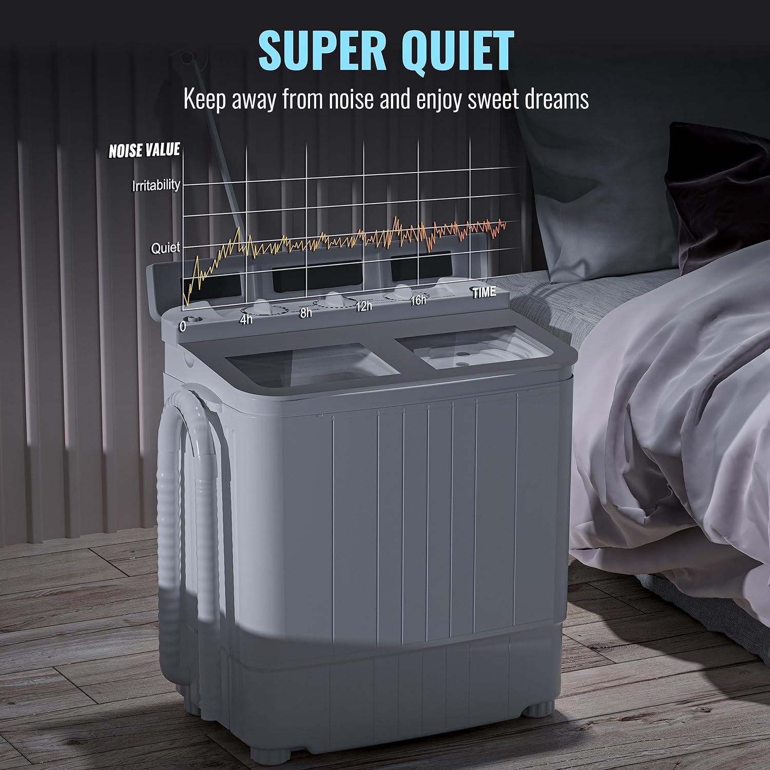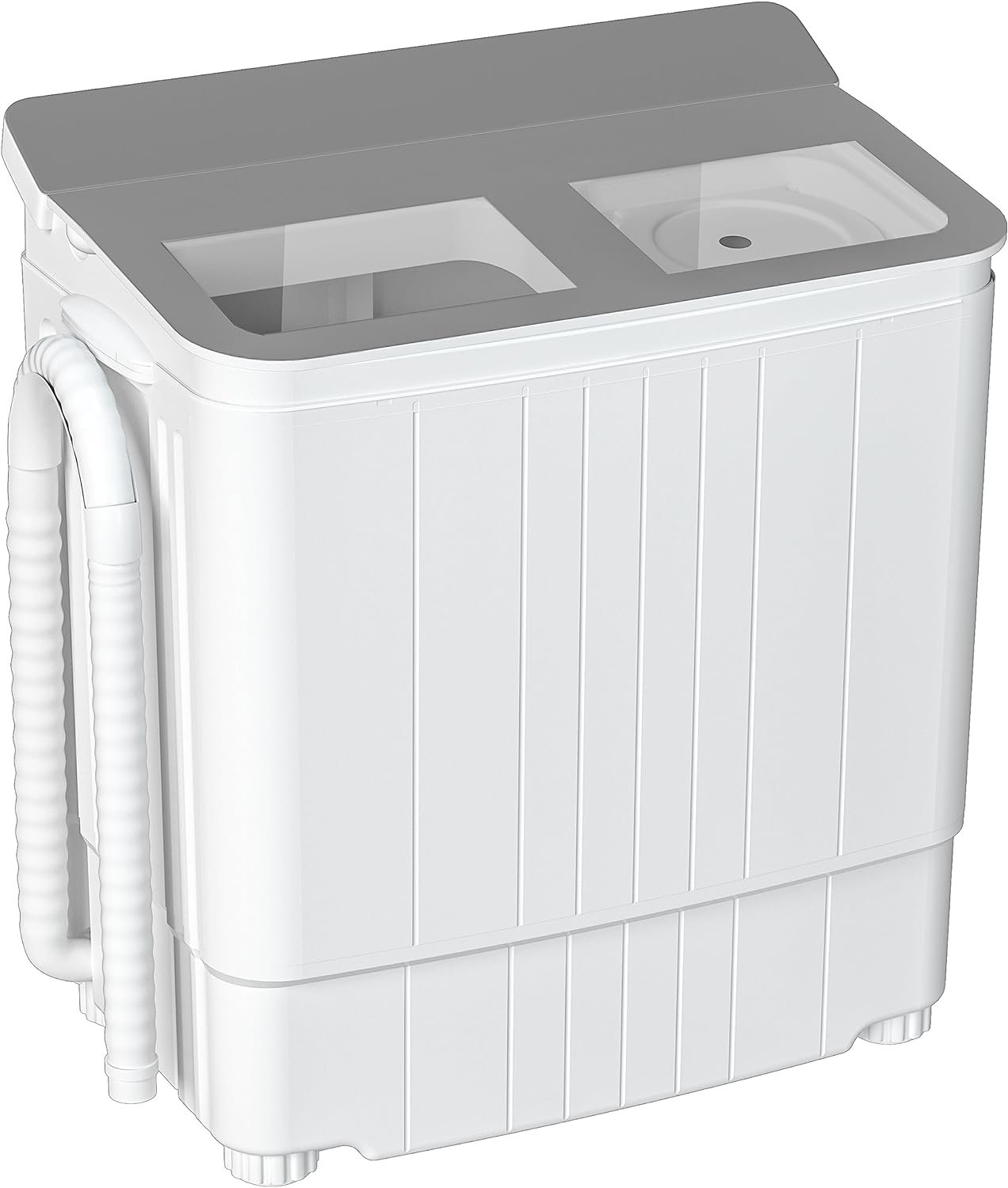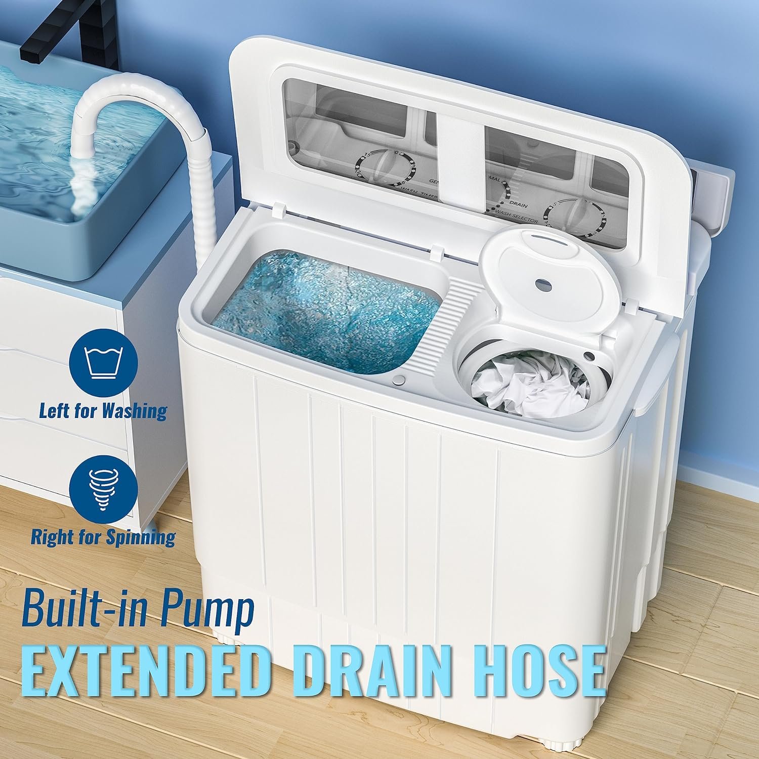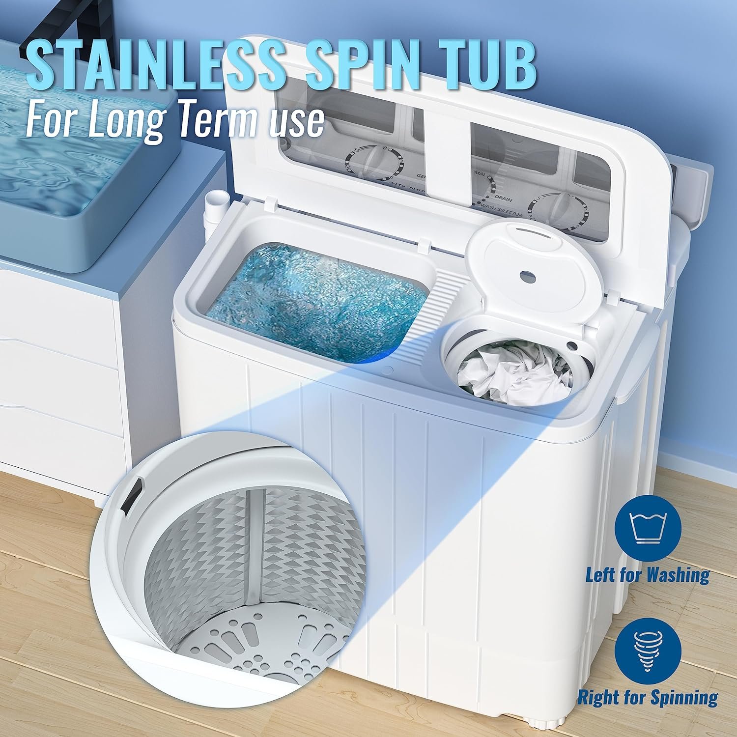 【Twin Tub Design】:300w washing power and 250w spinner power will help you use the item powerfully. Portable washer has a washing capacity of 11 lbs and a spinner capacity of 6.6 lbs.Perfect for washing various clothes,like shirt, socks and trousers.