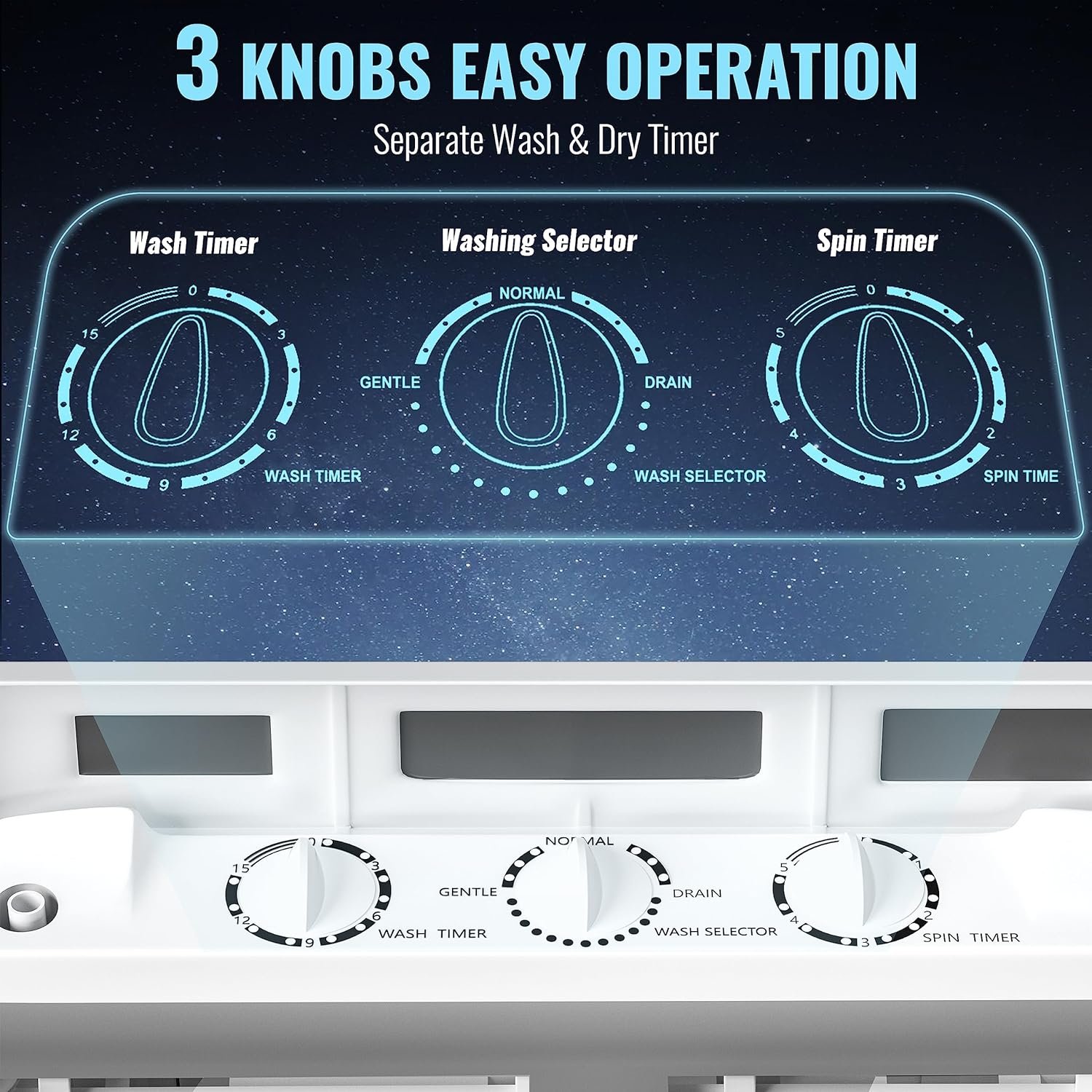 【Rich Clean Function】: Mini washer with separate timer control settings for washer and spinner operations, Washer Timer: 5 Choose (0/3/6/9/12/15 mins), Washing modes: Gentle/Norma/Drain, Spinner Timer: 5 Choose (0/1/2/3/4/5 mins).Free to set your timer and options.