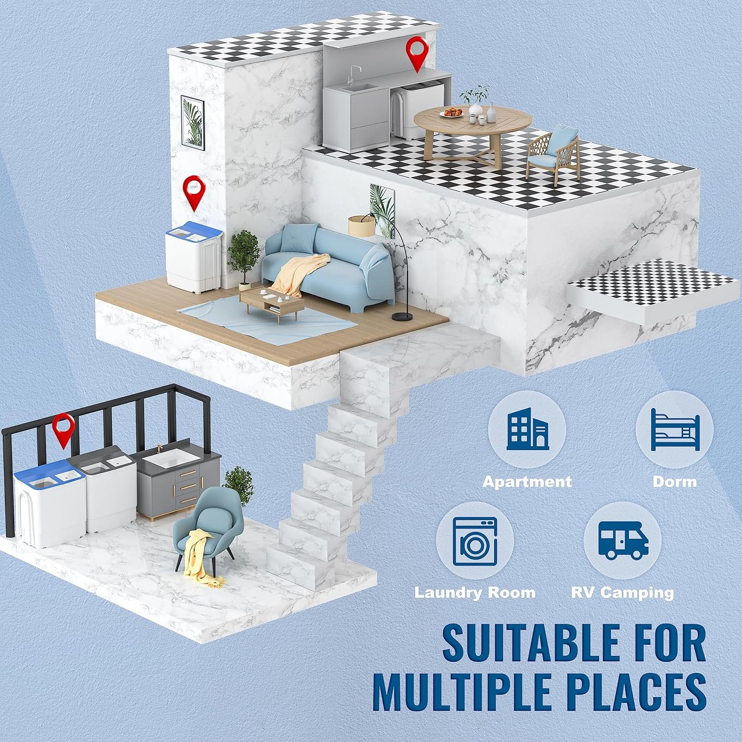 【Compact & PORTABLE】:The compact design makes this apartment size washer lightweight and easy to carry, suitable for use in places with limited space, such as trailers, apartments, dorms, RV trip.Drainage tube allows you to easily drain out dirty water.