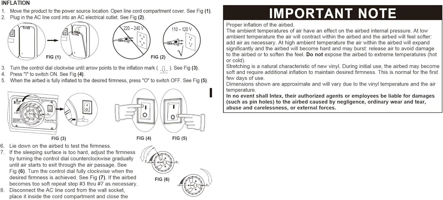 Please ensure the inflation dial is turned fully to the inflate or deflate position for optimal performance; Airbed Pump: Built-in