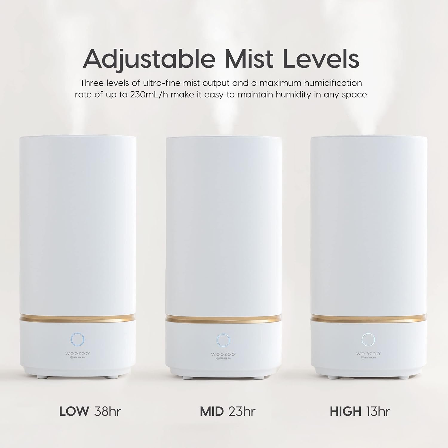 ADJUSTABLE MIST LEVEL: With three (3) levels of ultra-fine mist output and a maximum humidification rate of up to 230mL/h, the WOOZOO Ultrasonic Cool Mist Humidifier makes it easy to maintain humidity in your bedroom, living room, office, or any space at an ideal 30% – 50% at all times. Low humidity can cause problems such as dry skin, sinus discomfort, and can increase static electricity build-up. Better air quality makes for better sleep, helps alleviate dry skin, and even helps to keep plants healthy.