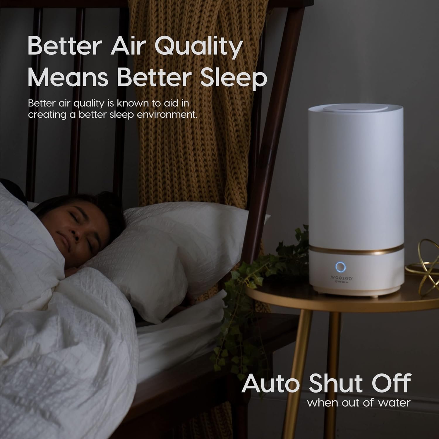 SIMPLE EFFICIENT DESIGN: Inspired by the Japanese word for vortex, “uzu”, the powerful and convenient WOOZOO Ultrasonic Humidifier offers all the comfort and ease-of-use you need with a straightforward single-button control system. Operation is quick and easy, just push the button and let it get to work.
