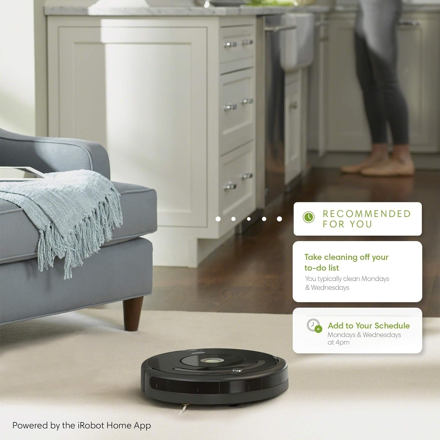 ADAPTIVE NAVIGATION – A full suite of advanced sensors allow Roomba to navigate under & around furniture, & along edges. Cliff Detect keeps it from falling down stairs.