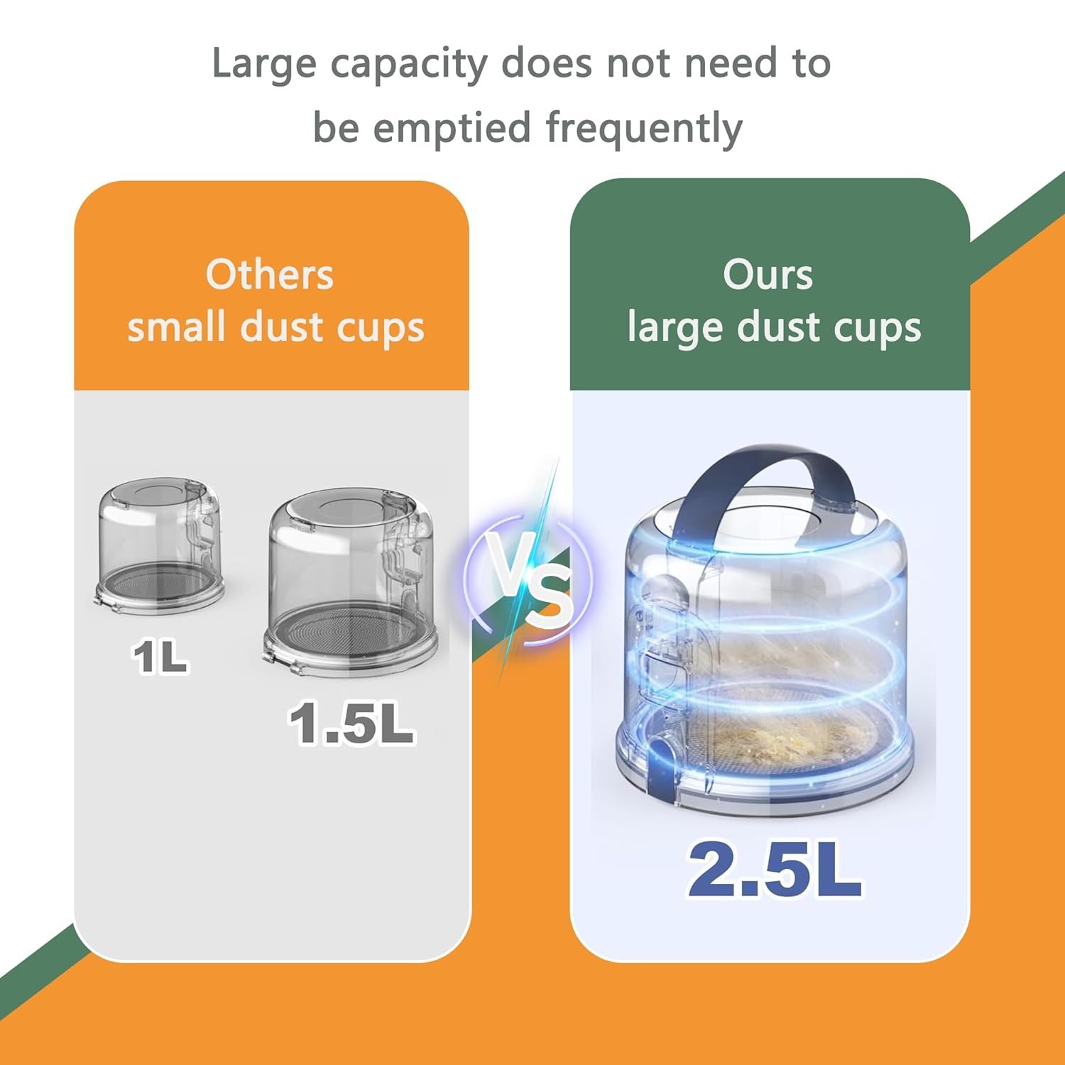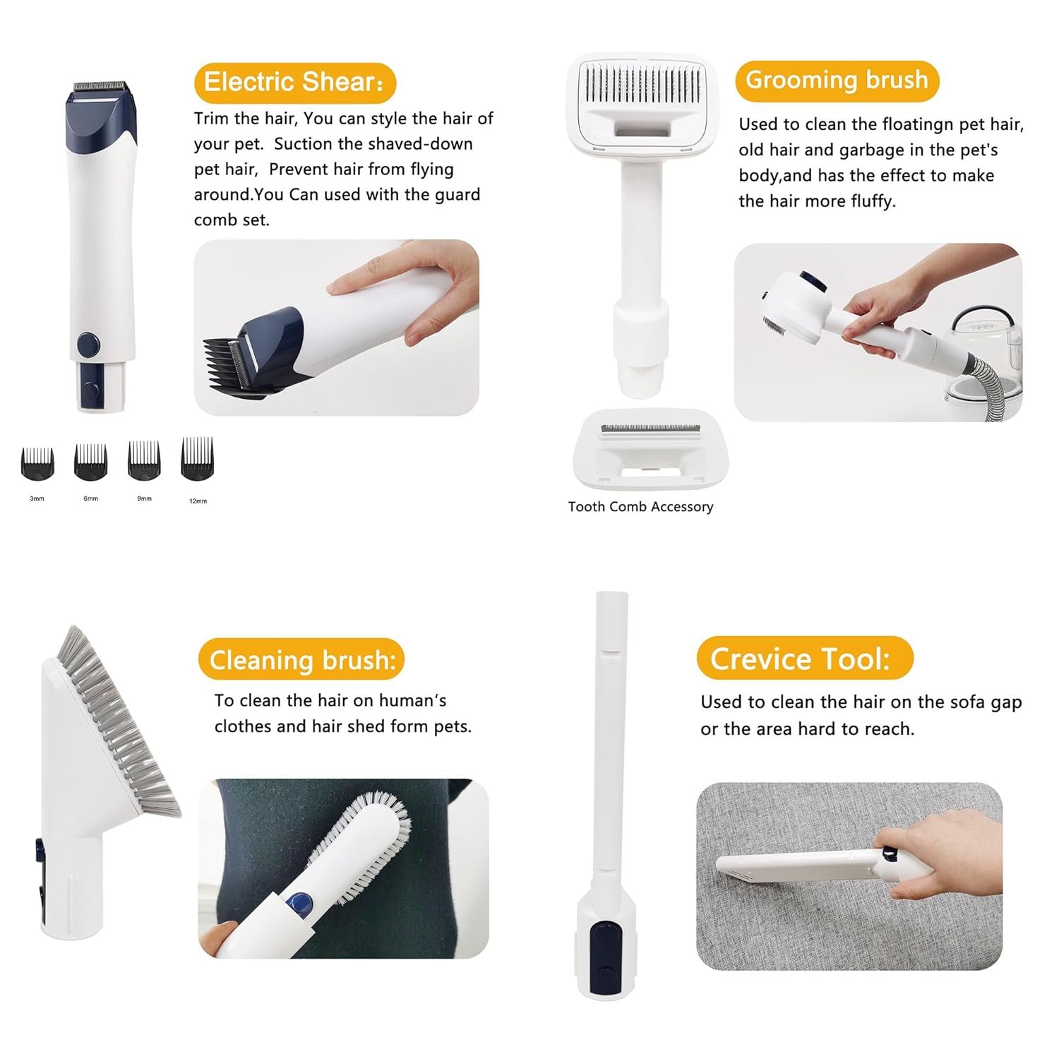 【4 brushes+2.5L Dust Cup】The kit includes a grooming brush, De-shade brush, dog clipper, nozzle head, cleaning brush, and more. (Have matched different sizes of replacement heads for grooming clipper, which are 3/6/9/12mm. Whether your pet is a short-haired cat or long-haired dog, you can find most suitable one hair clipper head for its hair length.) The 2.5L easy-empty dustbin with a removable dust cup equipped with an easy-empty lid makes cleaning up after grooming a breeze.