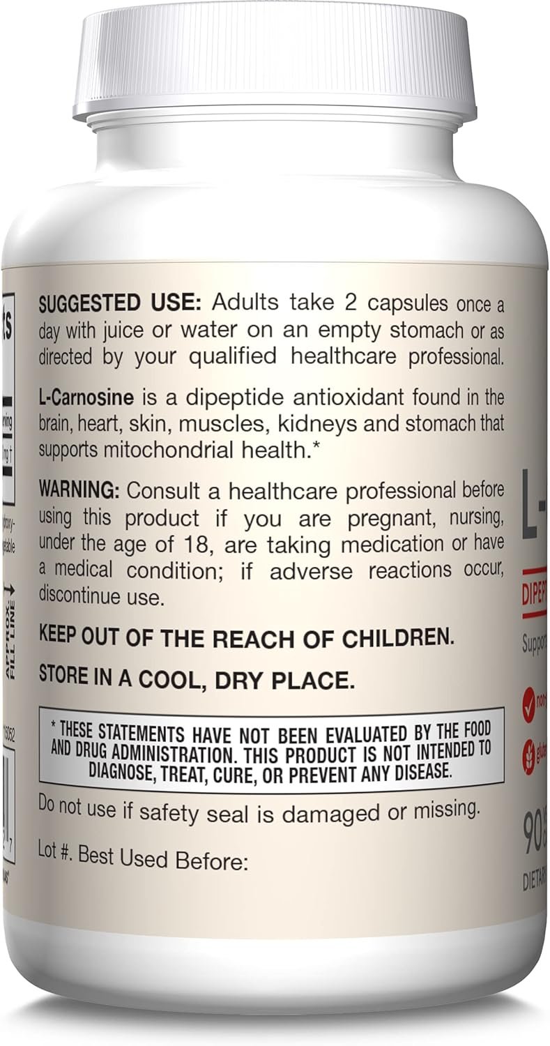 Amino Acid Supplement: One 90 count bottle of Jarrow Formulas L-Carnosine Dipeptide Antioxidant for mitochondrial health(1), provides 45 servings