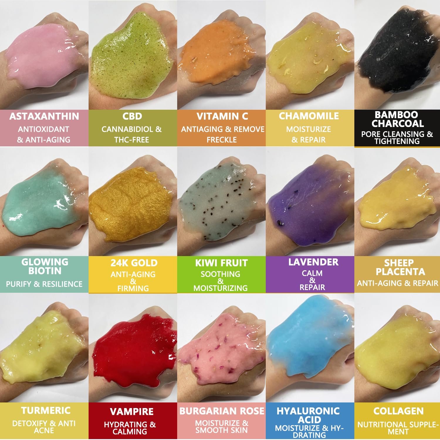 💦[JELLY MASK BULK PACK] You will receive 10 jars of jelly mask powder, including hyaluronic acid + collagen + 24k gold + rose + turmeric + chamomile + bamboo charcoal + lavender + kiwi + vampire . Each jar has a net weight of 500G/17.6Fl Oz. professionally provided for beauty salons and each jar can do 25-33 treatments. Each different scent has different effects. It hydrates the skin, anti-aging and firming, smoothing fine lines.
