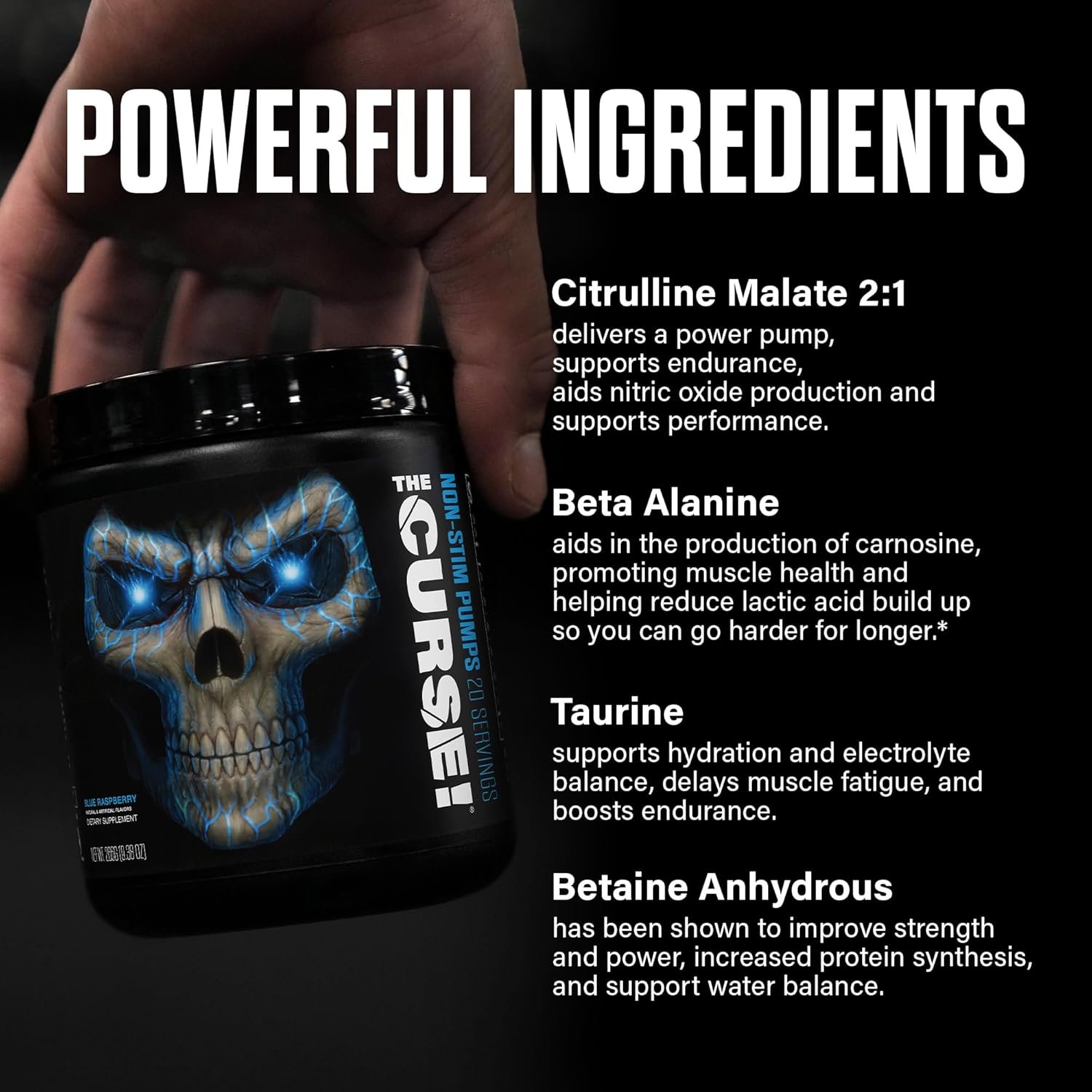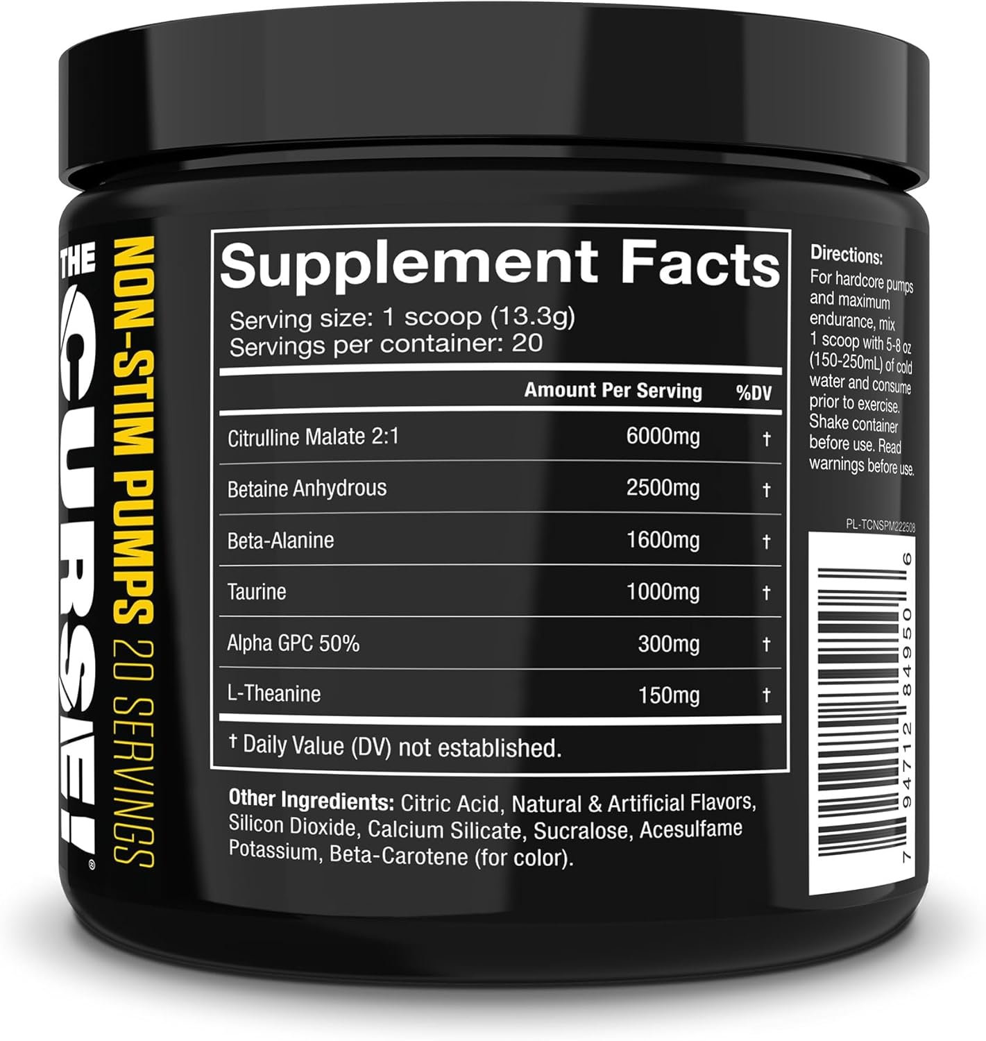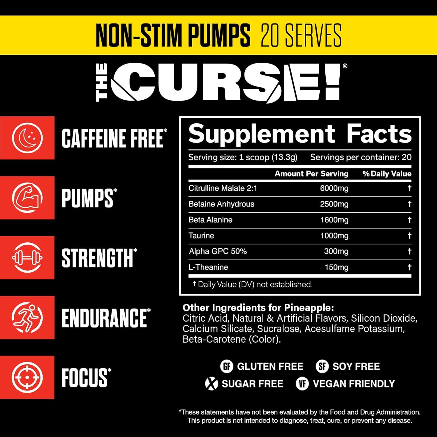 High quality, premium ingredients – this is the non-stim preworkout you’ve been looking for. Complete with Citrulline Malate 2:1, Betaine Anhydrous, Beta-Alanine, Taurine, Alpha GPC 50%, & L-Theanine, The Curse! Non-Stim Pumps promotes bigger pumps, more endurance, and tunnel vision mental focus for maximum power, insane mind muscle connection and bigger gains.*