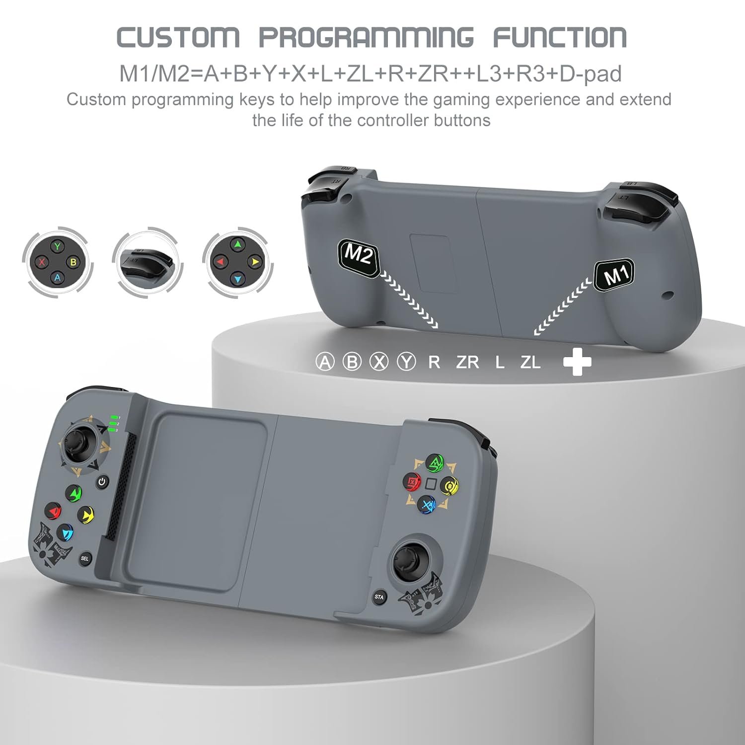 【Custom Programming Function-M1/M2】The gaming controller has 2 back programming buttons with single or multiple programming modes, M1/M2=A+B+Y+X+L+ZL+R+ZR++L3+R3+D-pad, custom programming keys to help improve the gaming experience and extend the life of the controller buttons.