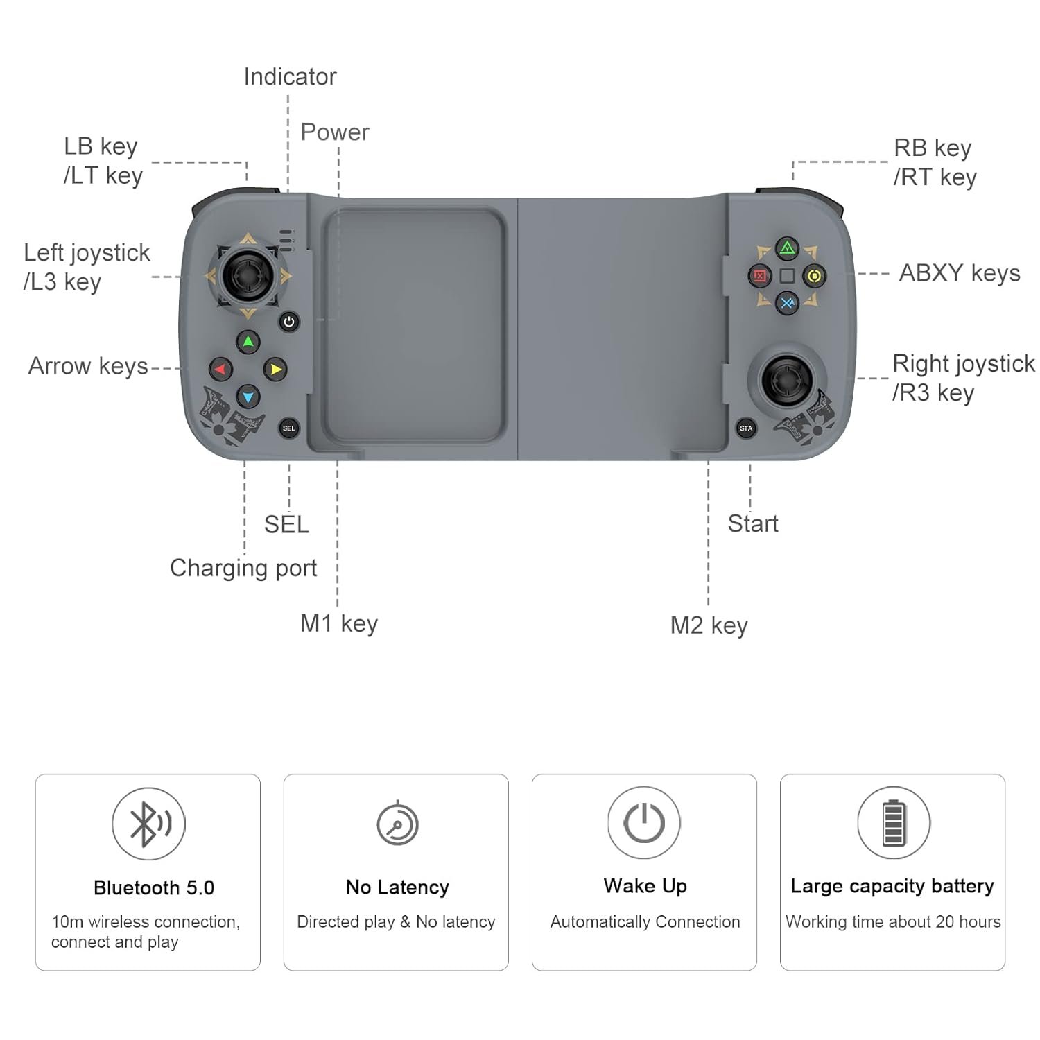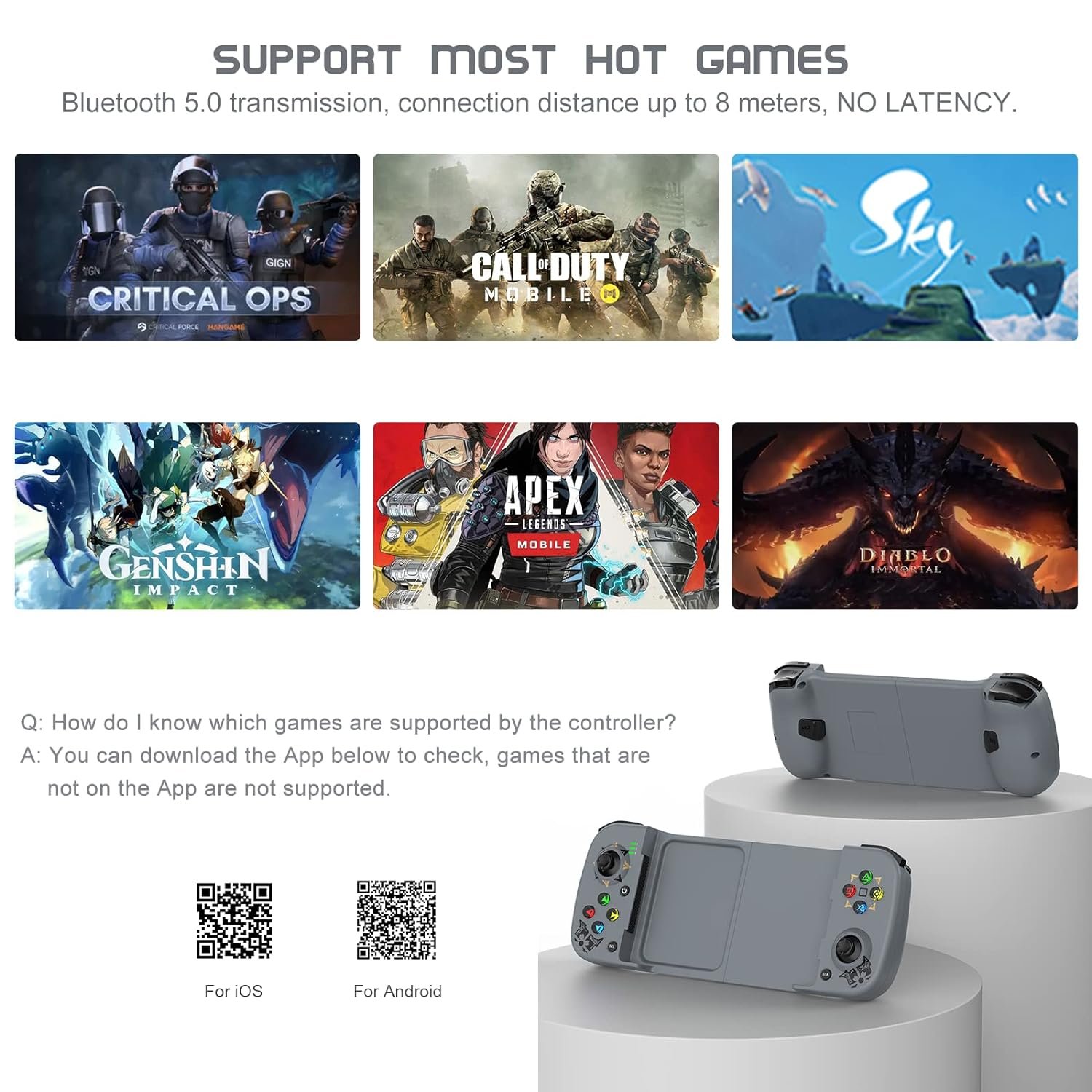 The Bluetooth game controller for Call of Duty Mobile, Genshin Immpact, Diablo Immortal, Sky: Children of Light, Modern Combat 5, Asphalt 9: Legends, CONTRA RETURNS, Street Fighter IV CE, THE king of fighters’ 97 and more. Compatible with cloud gaming services.