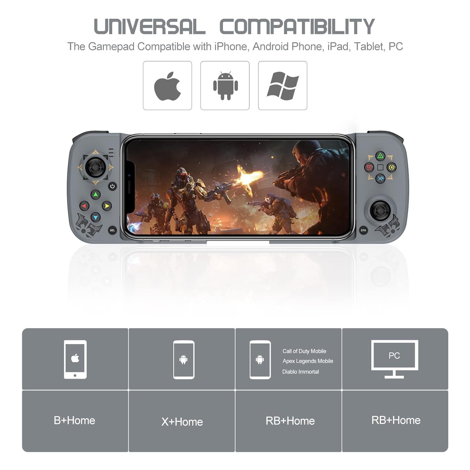 Multi-platform compatible: Compatible for iOS, Android, PC, Cloud and Mobile GamingDirect play: No need to download other apps and emulators, play directly.Custom programming function: Free your fingers and win the game more easily.Supported length of devices is between 5.0 – 6.9 inches. ( The controller’s telescopic holder can support up to 6.9 inches, so it does not support the iPad on the controller )