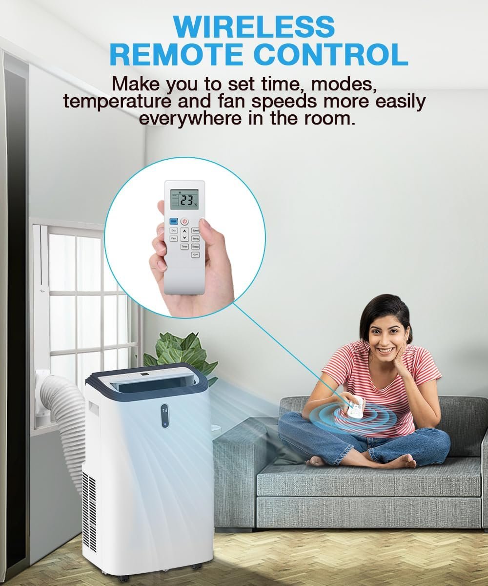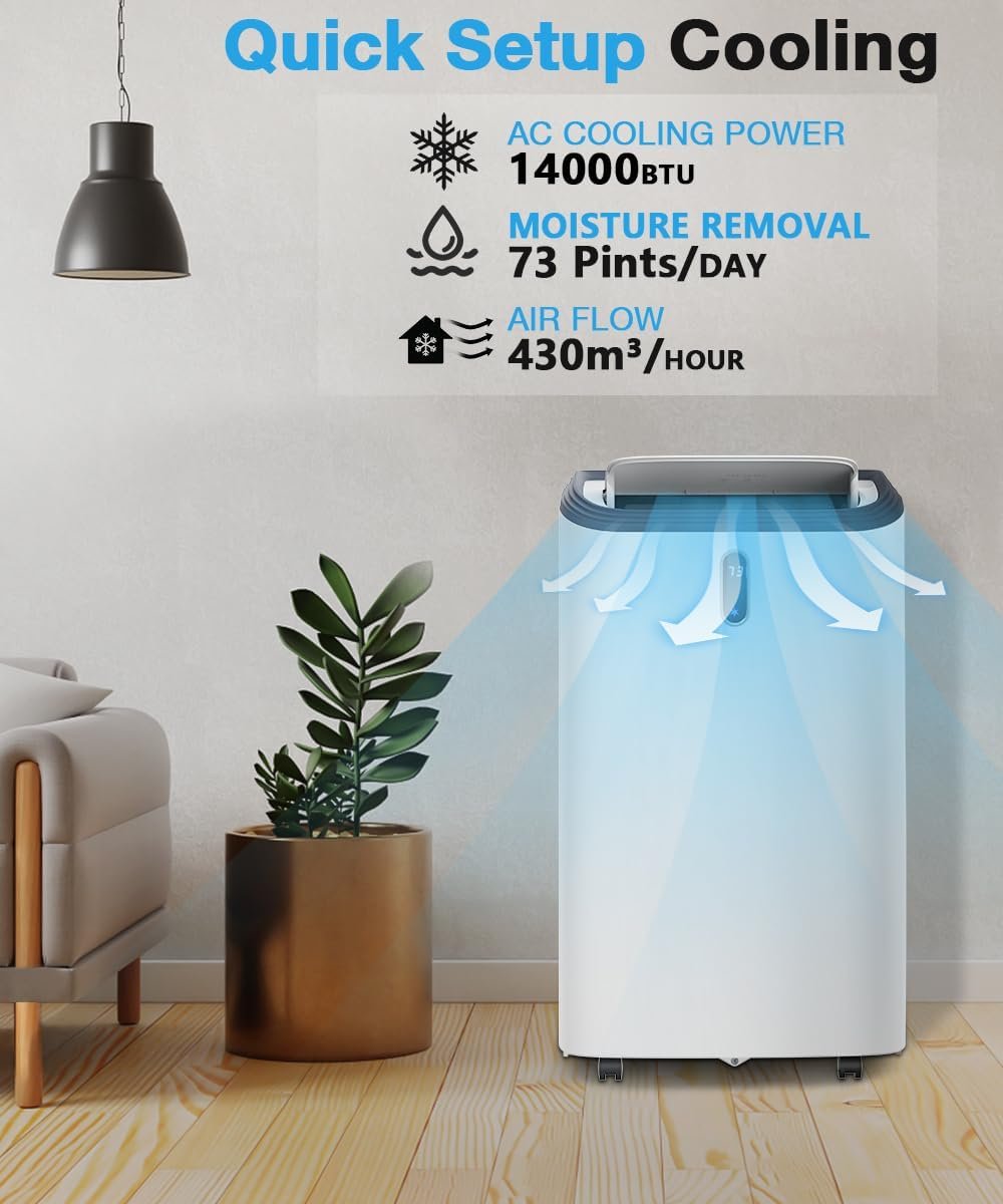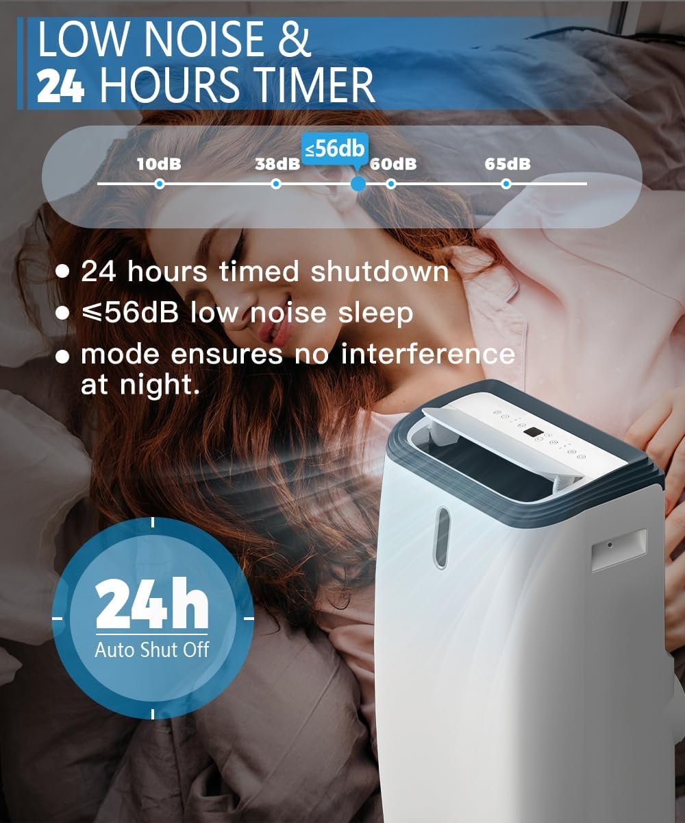 【Powerful & Quiet 】Our 14000 BTU portable air conditioner (18.5X13.9X30 inches) will keep you cool and comfortable all summer. At the coolest setting, it can cool the air to 61°F in 700 square feet space. In addition, the sleeping mode (54dB) ensures no interference at night.