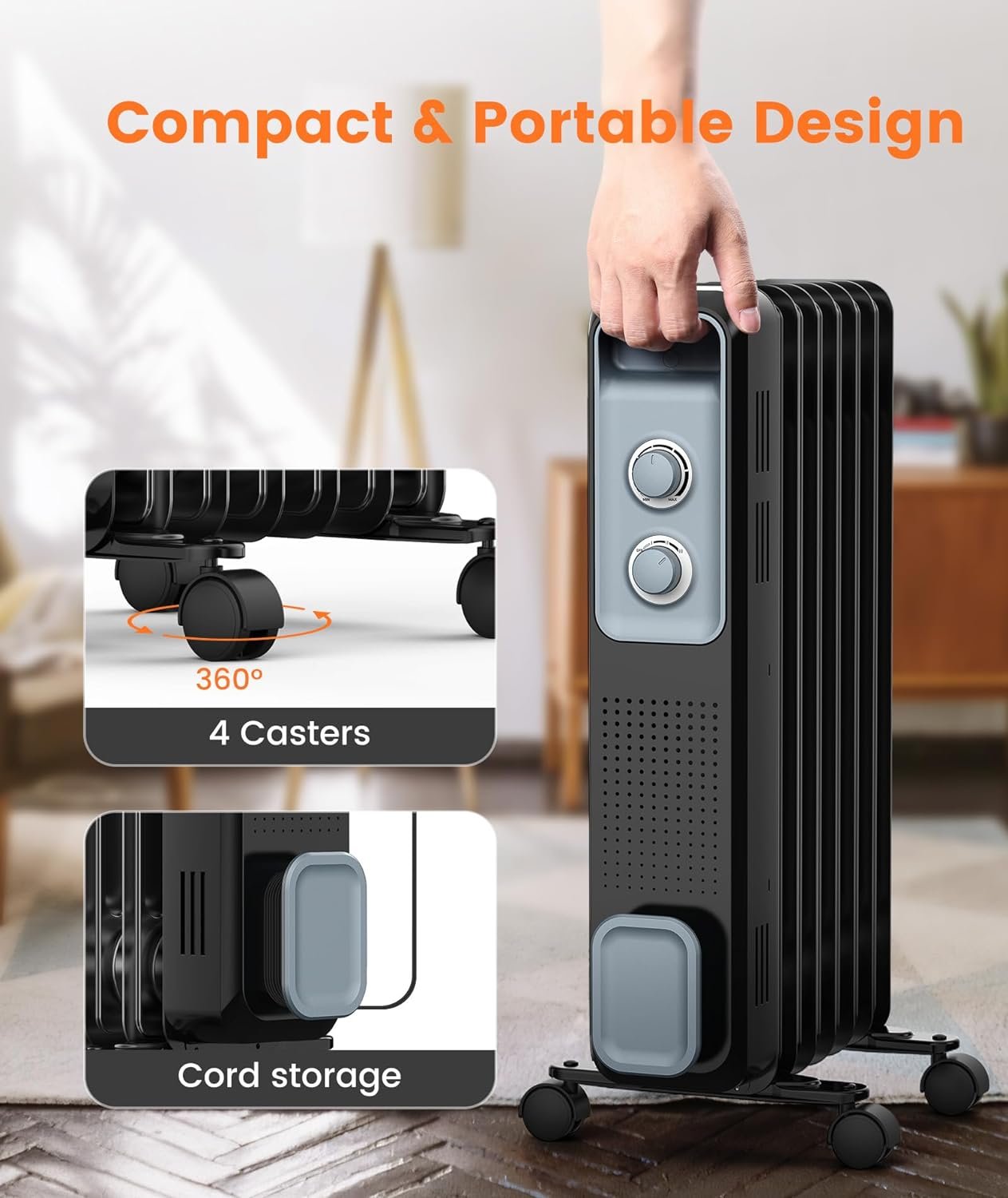 【Simple to Operate&Easy to Carry】Joy Pebble portable heater has only two knobs, which makes it easy to operate and can be used by both the elderly and children. And this portable space heater is equipped with universal wheels and carrying handle, bring it wherever you go, free to move.