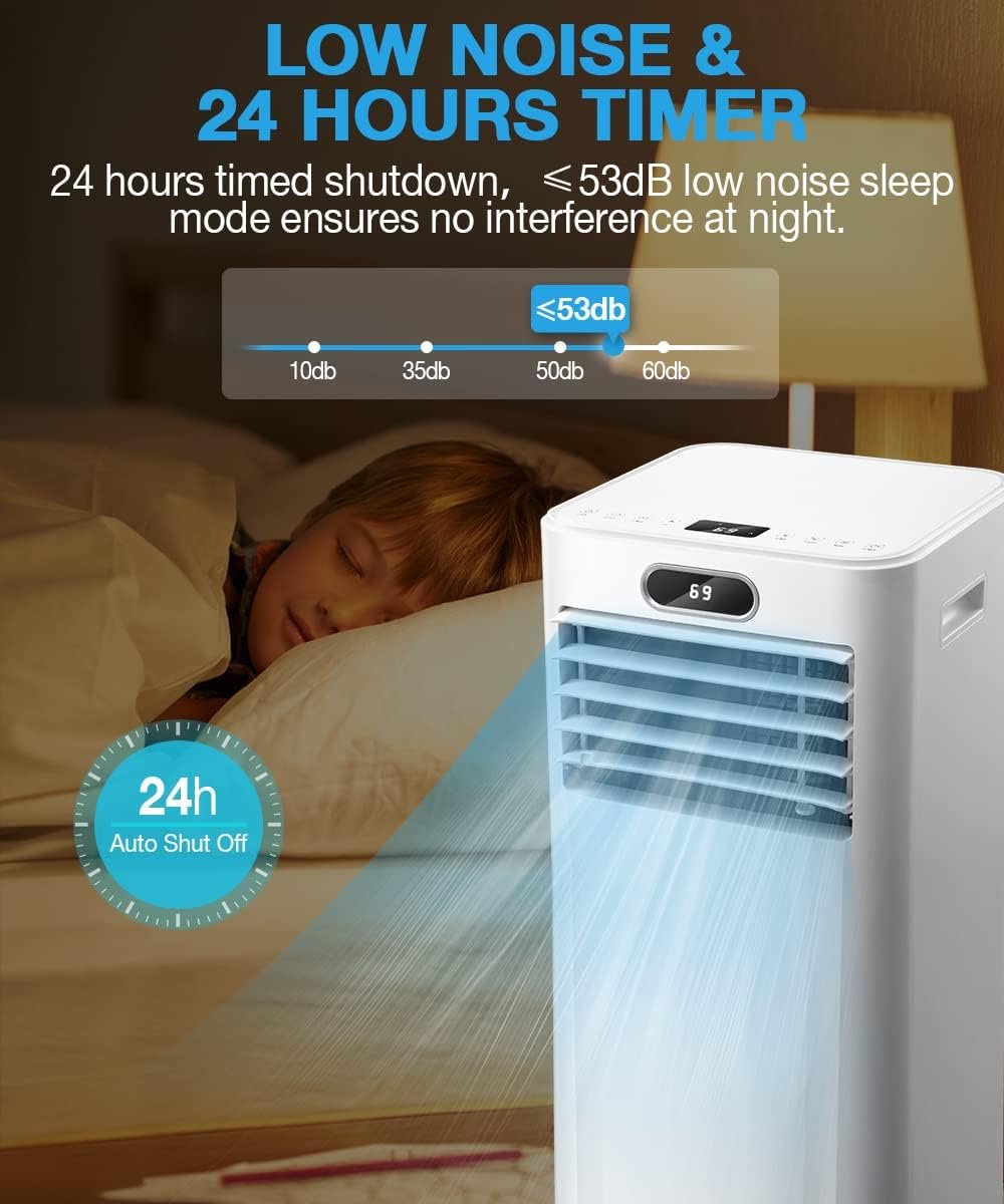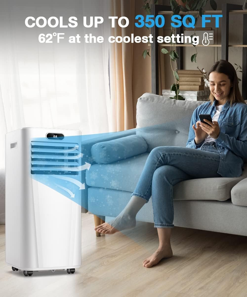 POWERFUL & QUIET : Our 8000 BTU ASHRAE portable air conditioner (15.75*13*34.64 inches) will keep you cool and comfortable all summer. At the coolest setting, it can cool the air to 62°F in 350 square feet space. In addition, the sleeping mode (53dB) ensures no interference at night.