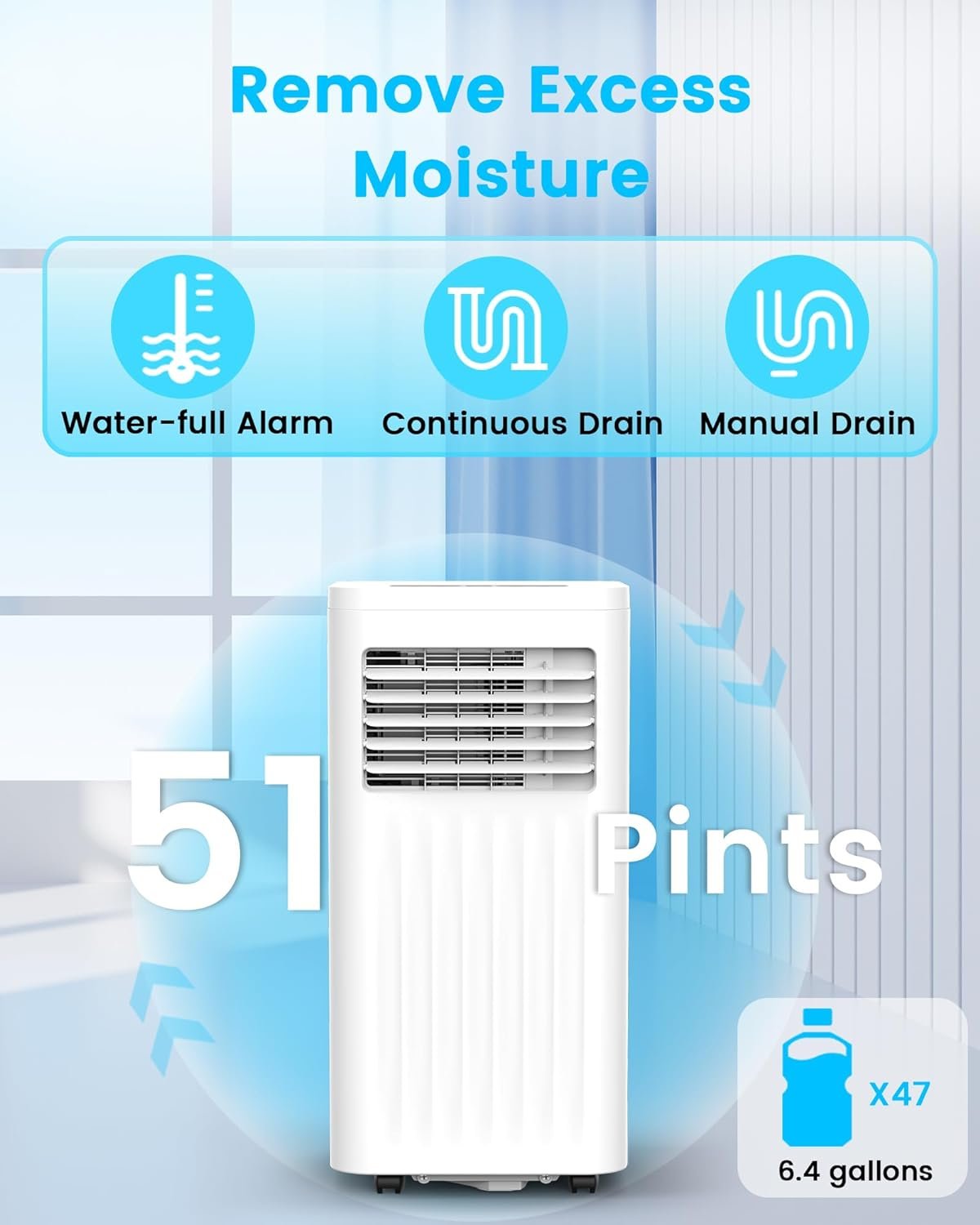 【3-in-1 Multifunctional Design】 This powerful AC unit combines 3 efficient functions with cooling, dehumidifying and ventilating to meet all your needs. In dehumidifier mode, it can keep your room cool and dry with 38pints moisture removal capacity per day. Automatic closing when the water tank is full,Moreover, there are 2 fan speeds (high/low) for you to choose from,