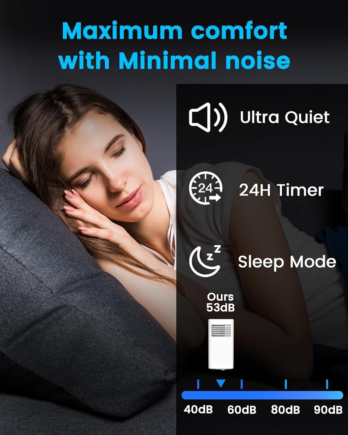 【 Low-noise Sleep Mode & 1-24H Timer】 In sleep mode, the air conditioner runs with a low noise to provide you with a peaceful sleep and working time. And the temperature will increase by 2° F every hour to prevent you from getting colds. In addition, the 1-24 hour timer allows you to sleep comfortably while keeping your energy bill low.