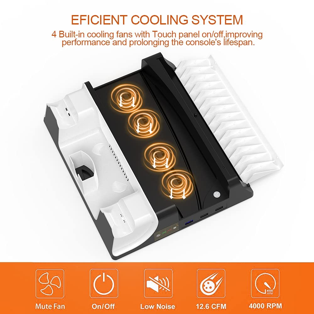 [PS5 Efficient Suction Cooling Fan]-4 pcs Built-in low noise fans Cooling down Playstation 5 console efficiently with touch panel on/off on base,improving performance and prolonging the console’s lifespan.