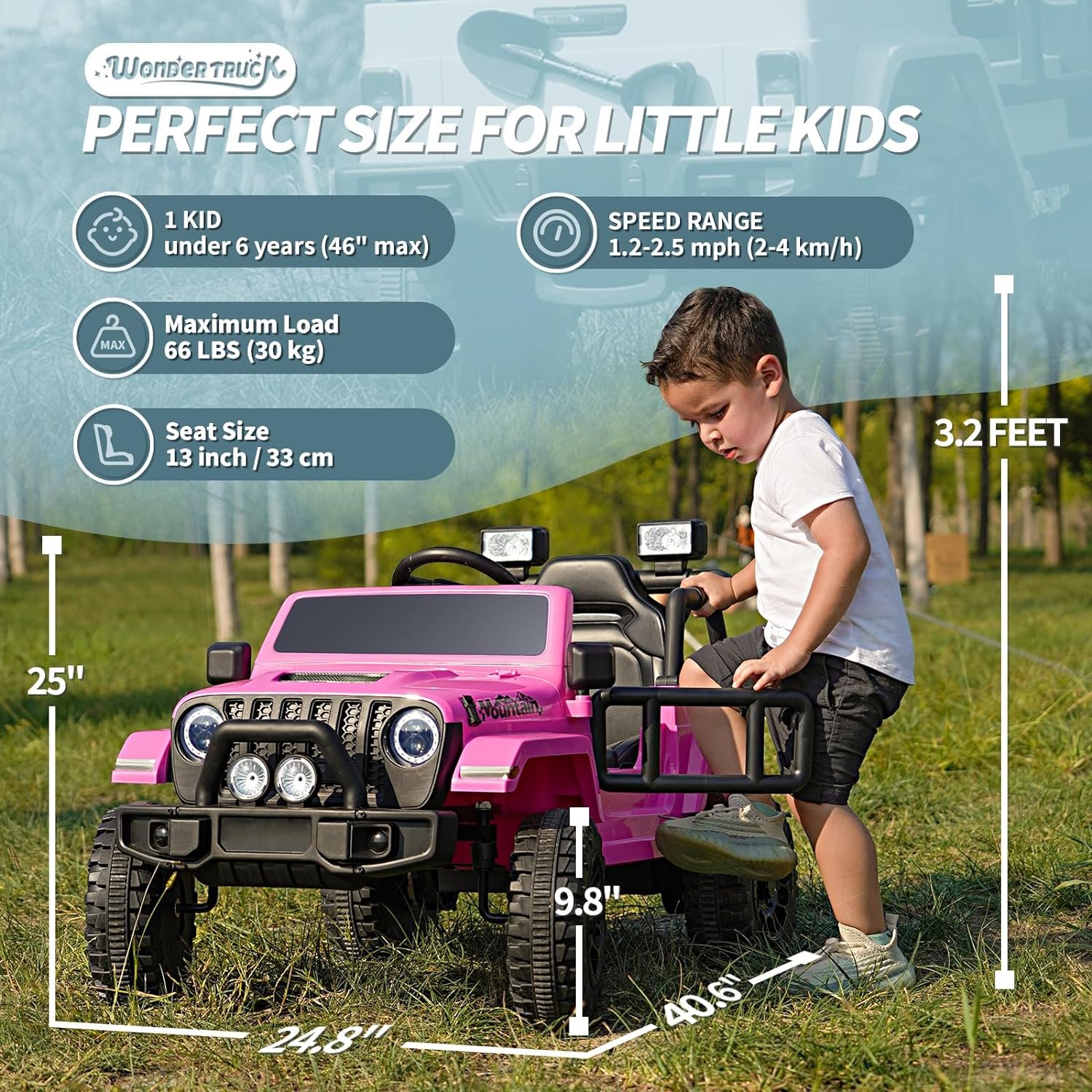 12V Powerful Truck – Joywhale kids ride-on truck equipped with 12V dual motors. Its powerful rear motors and wear-resistant wheels can support driving on a variety of terrain. 2.5 mph maximum speed for smooth rides on outdoor adventures. This 12V truck is designed by Joywhale specifically for kids under 6 years old. We’ve made significant improvements to the product size, so you can spend less. Plus, this car offers ample space for a child to play without any restrictions!