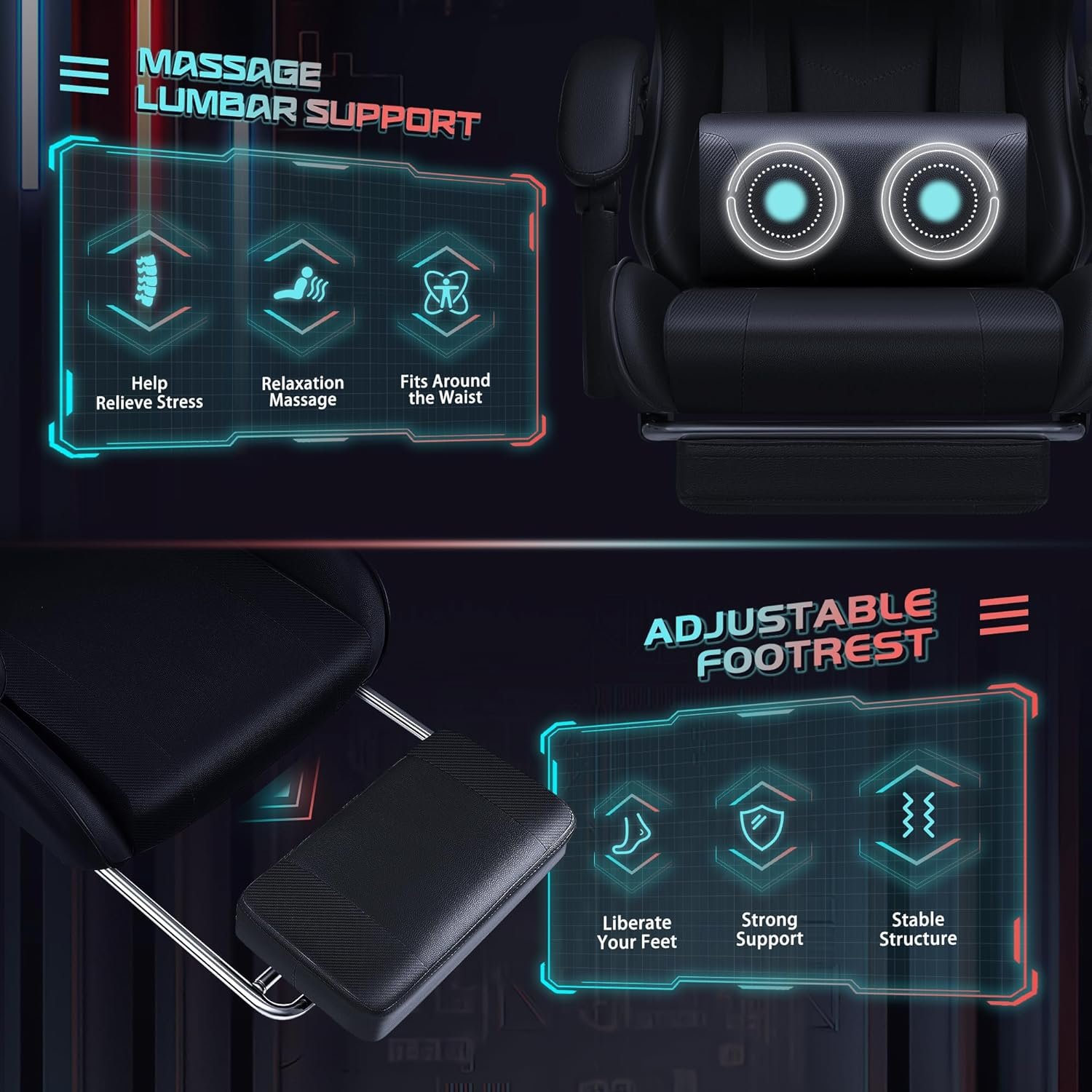 Ergonomic Design: Will playing games or work with your head down for a long time make you feel tired? Or do you want a chair that can make your gaming life more exciting? Our game chair is your choice. Equipped with flexible headrests and massage waist pillows, when you feel sore, you can rest assured on the back of the chair, providing comfortable neck support and excellent back massage
