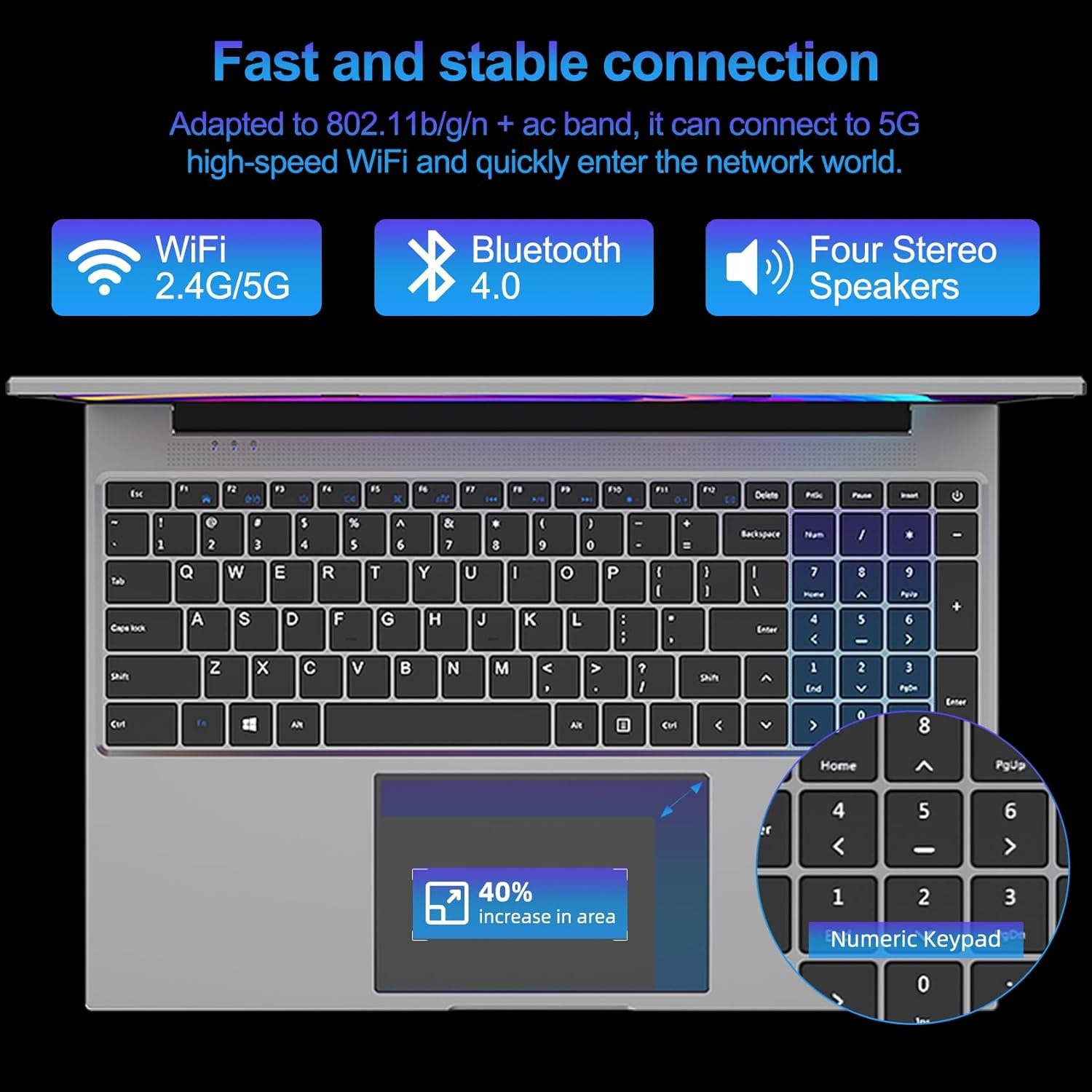 Comfortable Typing Experience: Laptops are equipped with dual-band WiFi (2.4/5G WiFi)/BE4.0, with 38WH Li-polymer battery, with fan and ventilation holes for heat dissipation, fast heat dissipation and low power consumption. The laptop is equipped with a separate numeric keypad, a large touchpad and a large keyboard for comfortable typing and high efficiency.