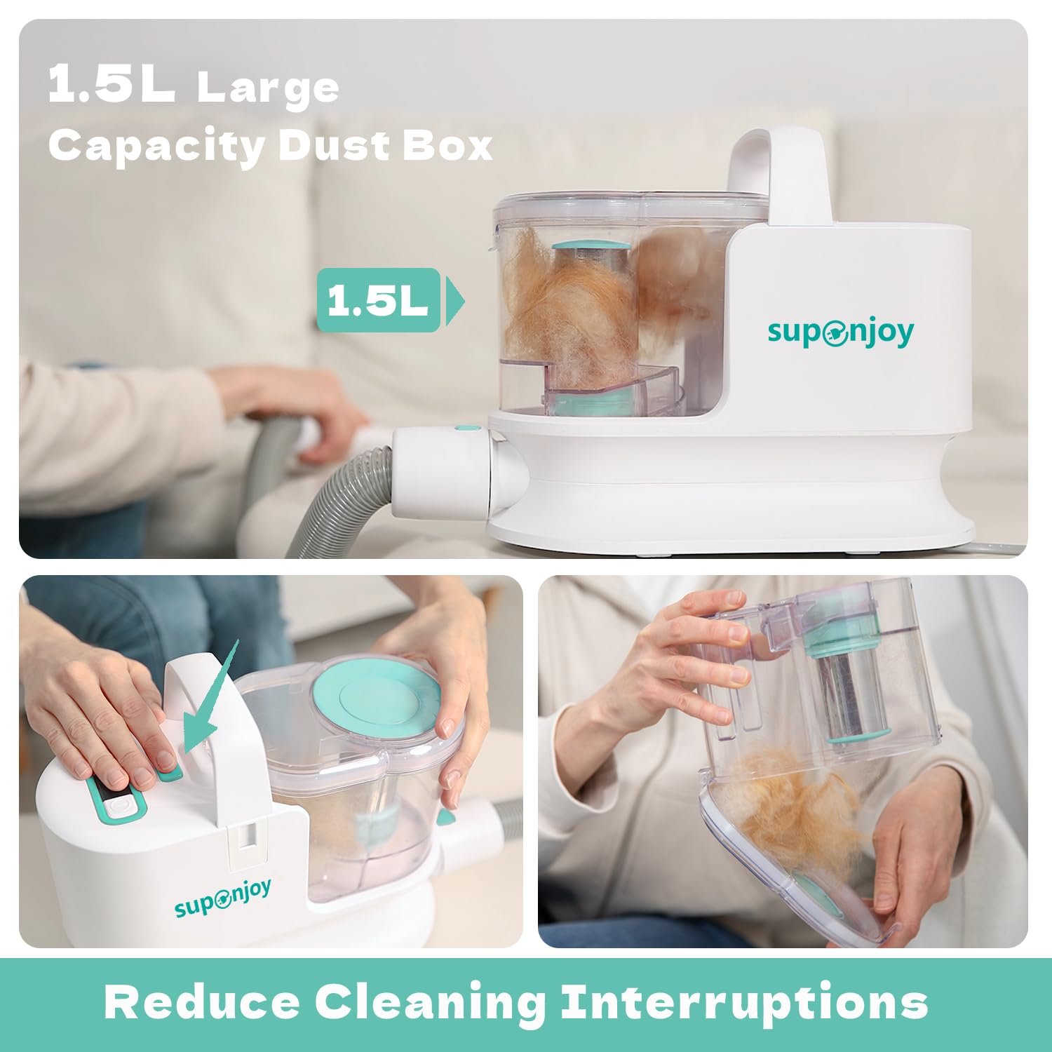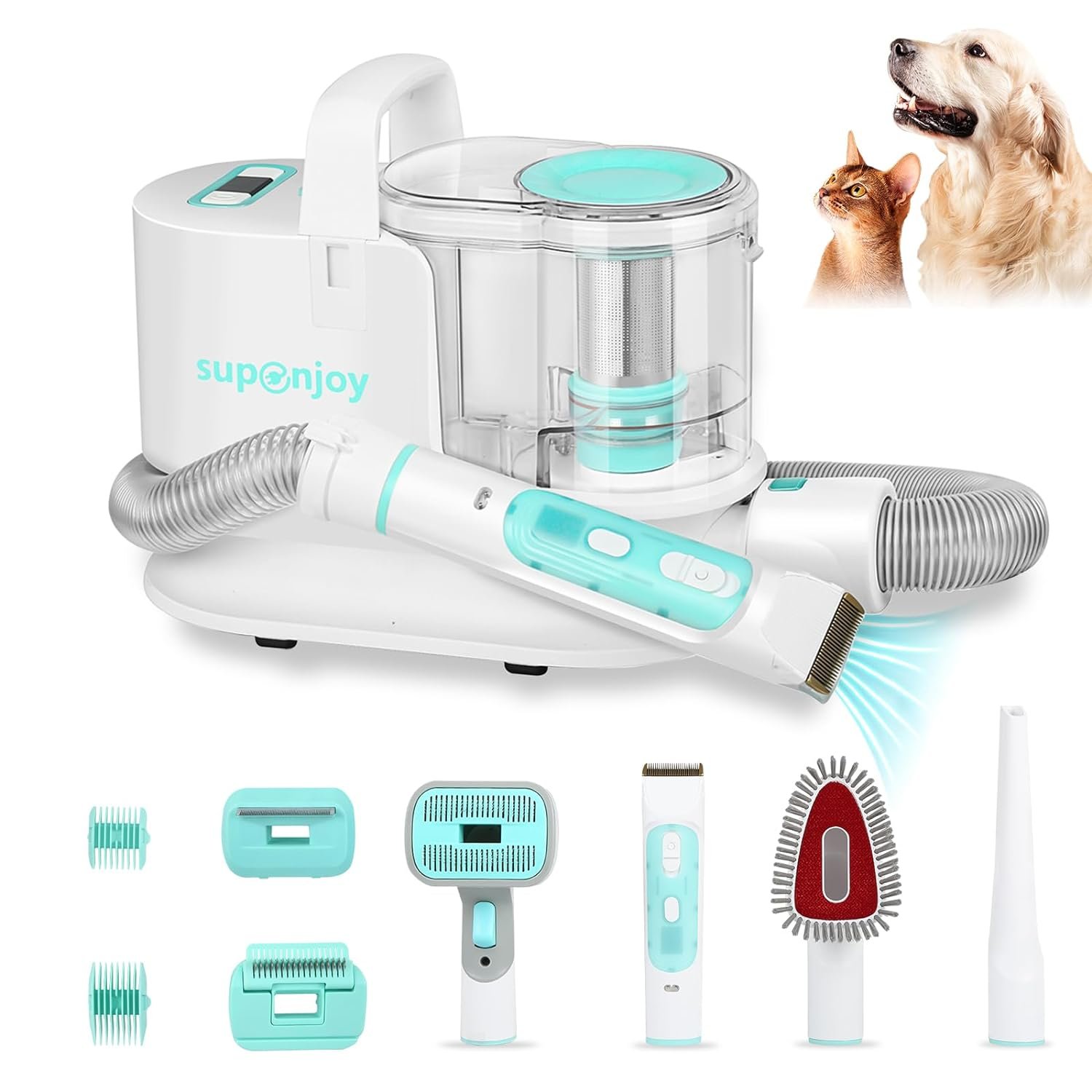 🐶🐱【6-in-1 Pet Grooming kit】Supenjoy dog vacuum for shedding grooming is meant for dogs and cats and comes with a set of 6 grooming tools. Including a rechargeable electric clipper which provide a perfect cut, a daily grooming brush and 2 replacement panels: deshedding comb and dematting undercoat rake comb. The kit also bundles a crevice and brush tool to help clear pet hair and dander from sofa crevices and surfaces