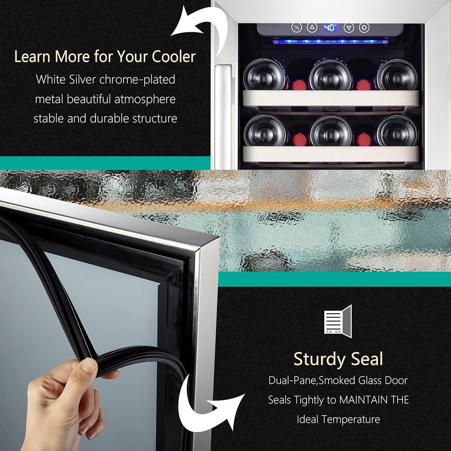 ★STAINLESS STEEL DOOR & AIR OUTLET: Special stainless steel frame with 2 layers of tempered glass stabilize temperature levels inside and keep glass from fogging. This wine refrigerator with automatic defrosting function, this function would work every six hours. The air outlet is so cool and fit for different kitchens, you could put the unit anywhere you like.