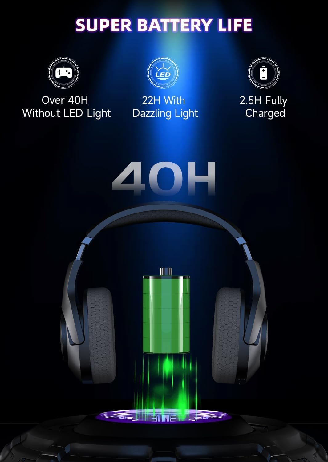 【40% Increased Air Permeability & Amazing Battery Life】Indulge in comfort with wireless gaming headphones, pro-grade breathable mesh, and PS5 headset wireless wide headband protection. Its adaptive design suits all face sizes, offering feather-light comfort. Get 40+ hrs battery, 25 hrs LED mode, voice prompts, and full charge in 2.5 hrs.