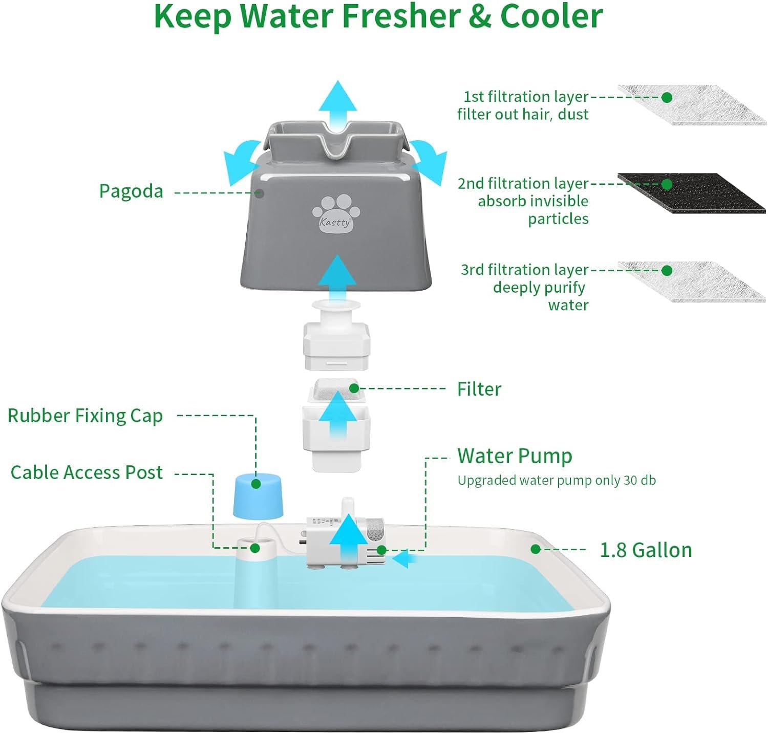 【Triple-Filtration System + Light Reminder Pump】 The triple-filtration system, including an activated carbon layer, and double thick non-woven fabric, keeps water better tasting and safer for pets. Lack of water protection: pump auto shuts off and the LED light transfers from blue to red to remind you of refill timely in low water levels.