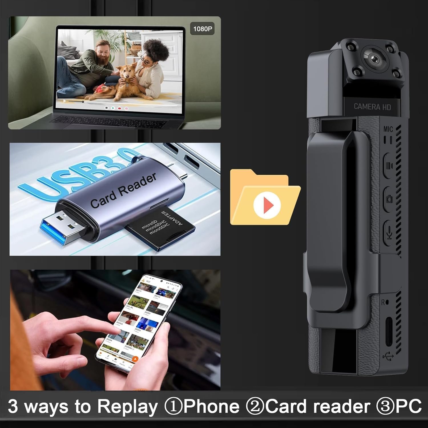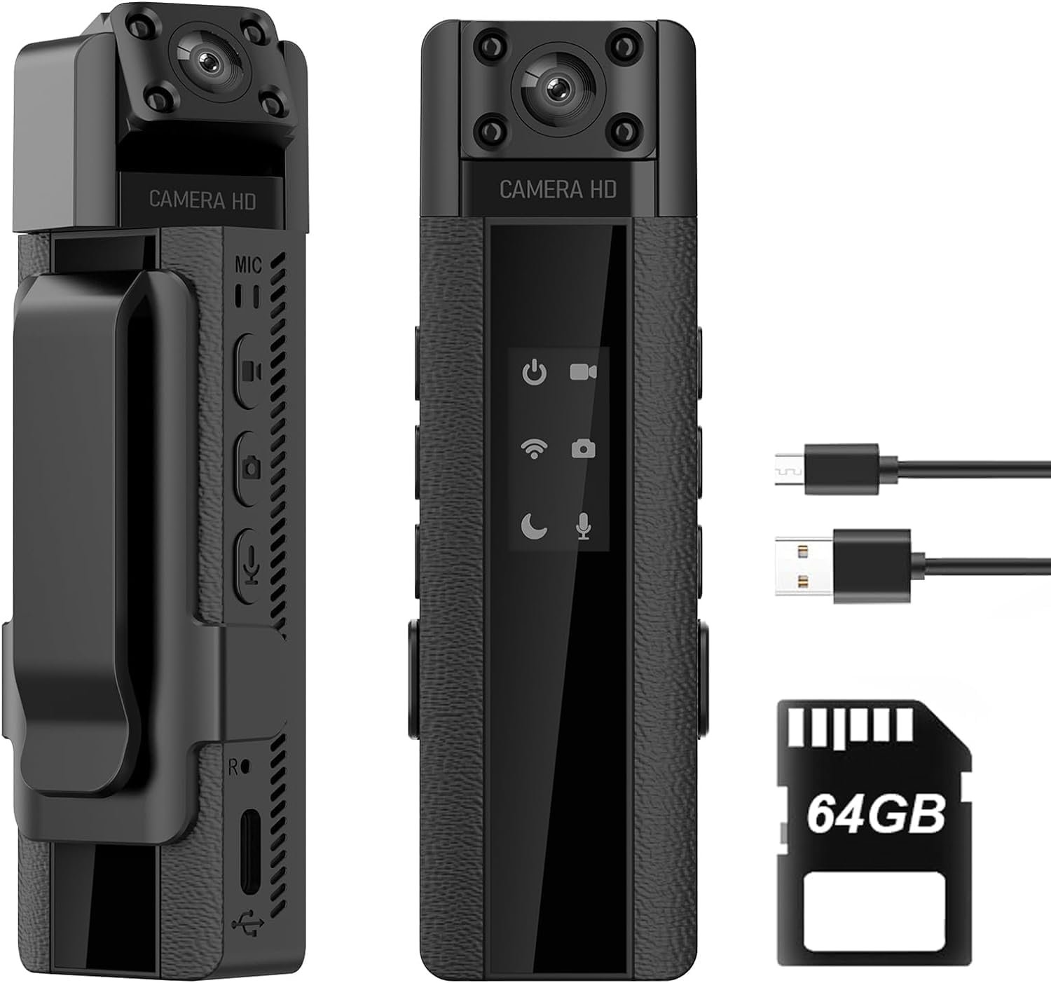 Kaysunlink WIFI Mini Body Camera with Video Recording is easy to operate, the lens can be rotated 90° up and down + 180° left and right, super wide angle, 1080P with 64GB Memory Card .Perfect for patrol,hiking,sport and biking recording.