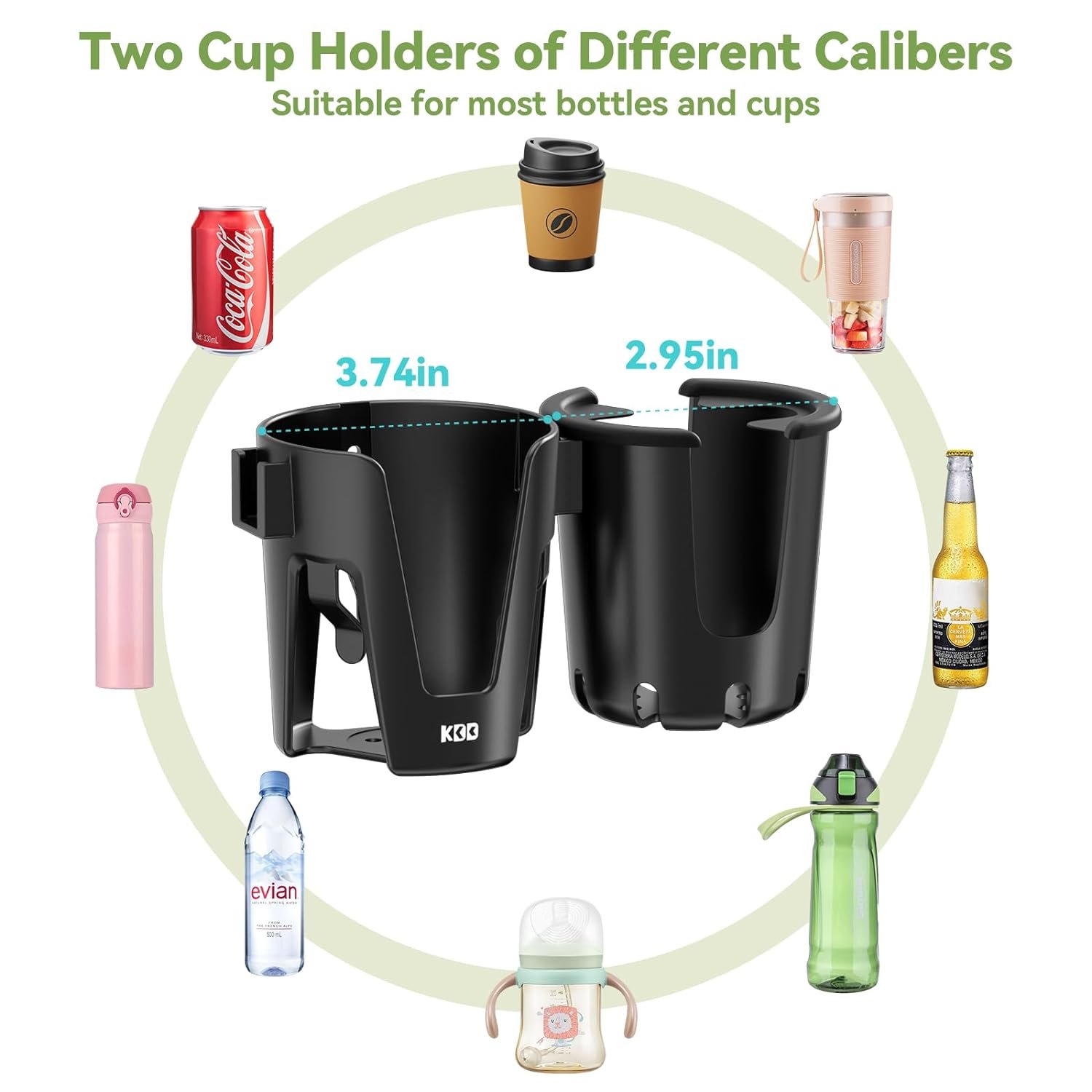 【Compatibility】The main cup holder of this dual cup holder has a diameter of 3.54in to accommodate larger cups or water bottles. Cup holder 2 is more suitable for baby bottles. The dual-purpose unique design is compatible with almost all cups water bottles such as coffee cups, baby bottles, Sippy cups, mini cups with handles, Coke bottles and Yeti cups.