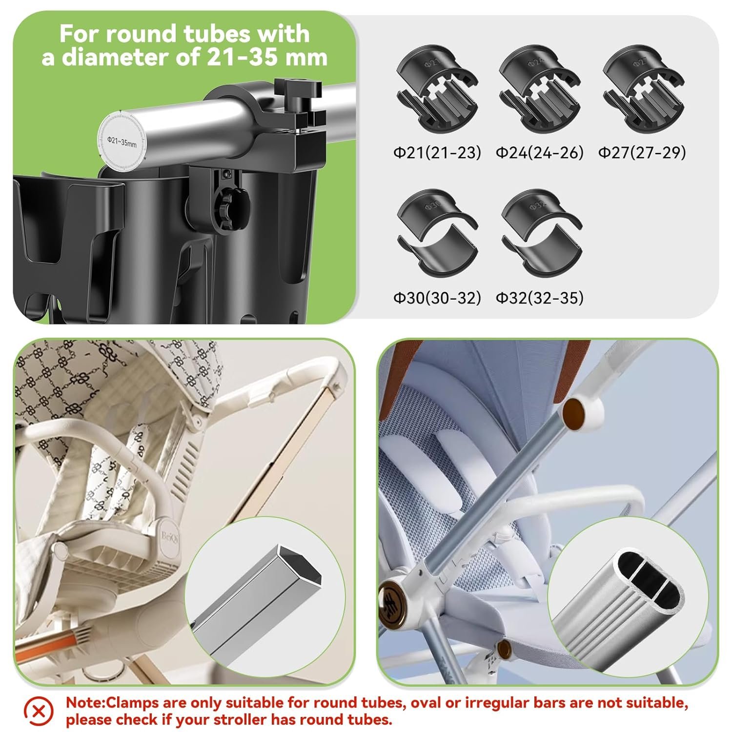 【Safe and Stable】Unlike other uppababy cup holder in the market, our universal stroller cup holder is designed with closed clamps with non-slip rubber pads, which helps to lock the cup holder to the bar without moving to keep it stable, and you can also rotate the clamps 360 degrees to mount it on the crossbar at different angles.