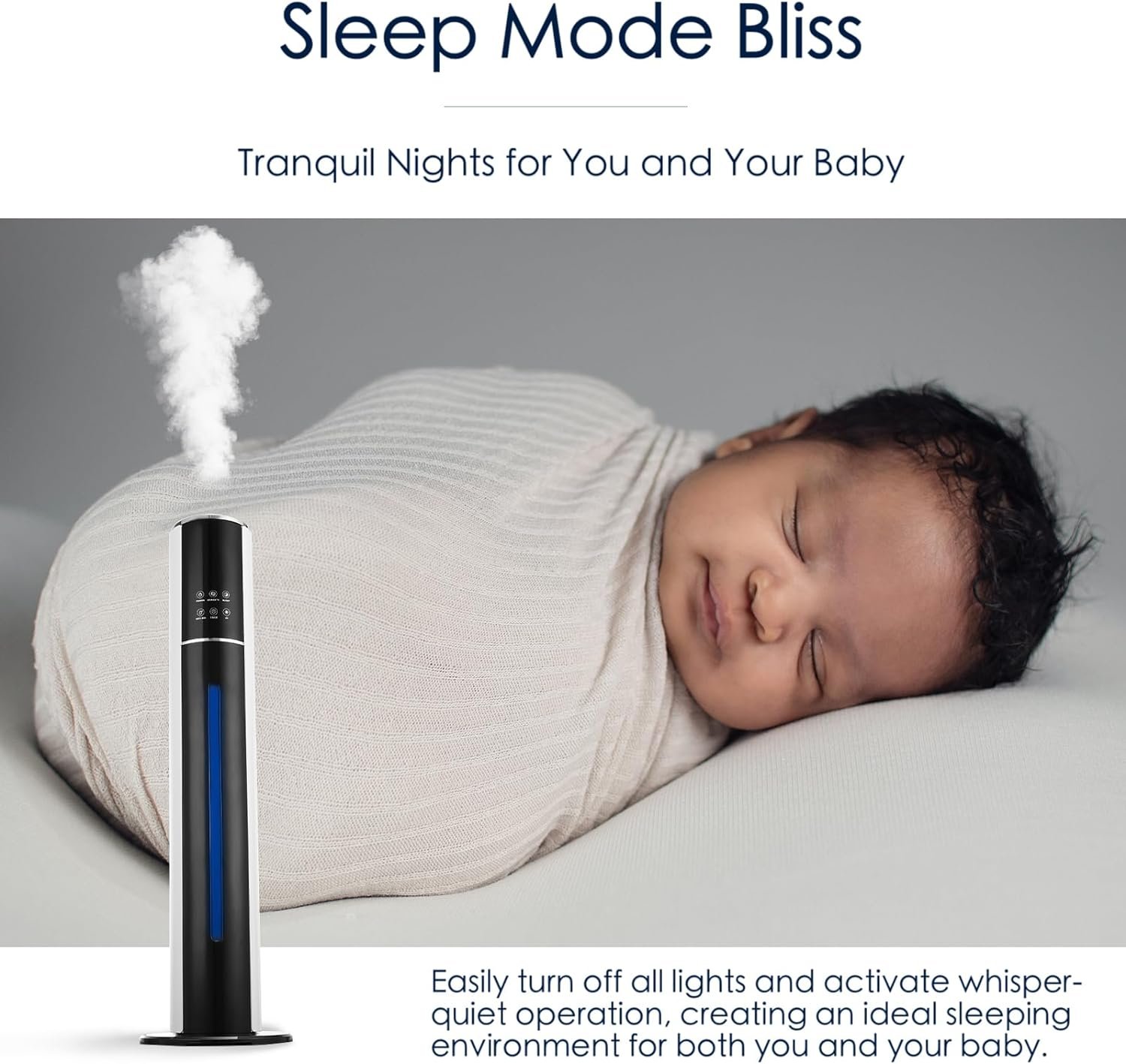 【LED Display & Sleep Mode】LED indicator can intuitively display the current humidity, touch control is convenient for users, the sound is lower than 35dB during night operation, all lights can be turned off in sleep mode, allowing you and your baby to have a whisper quiet sleeping environment. When the water tank is empty, the humidifier will automatically shut off to prevent damage and ensure your safety.