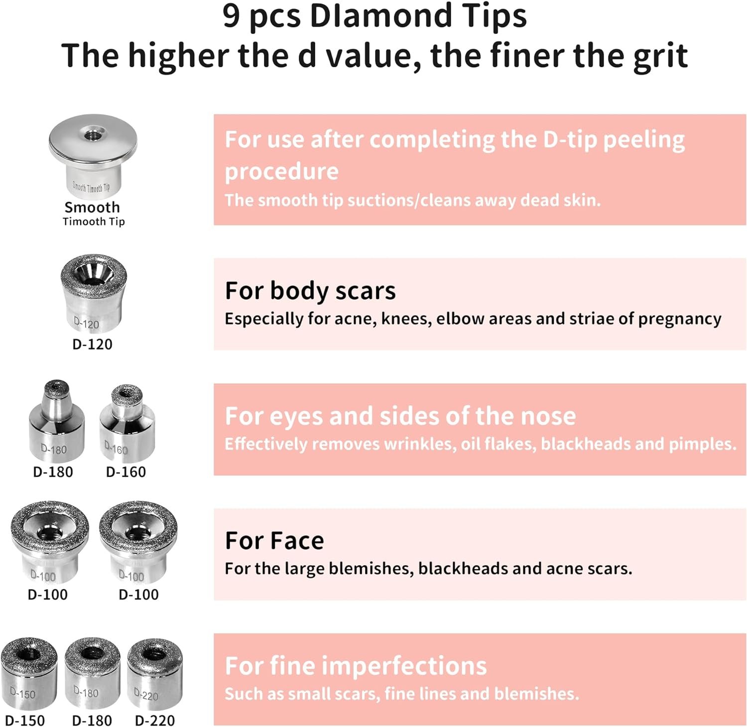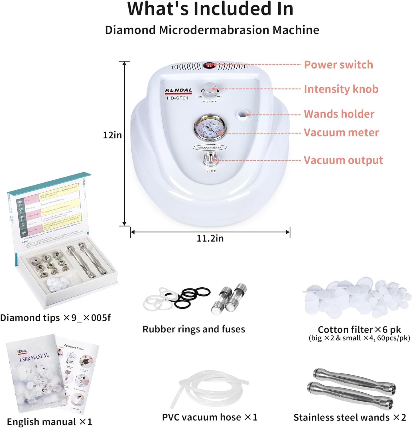 9 Replacement Diamond Tips: Kendal diamond microdermabrasion machine with 2 diamond wands and 9 types of diamond tips. Different diamond tips are available for different needs and different parts of the face or body. Choose the right diamond tips according to the skin needs of the area where they are to be used.
