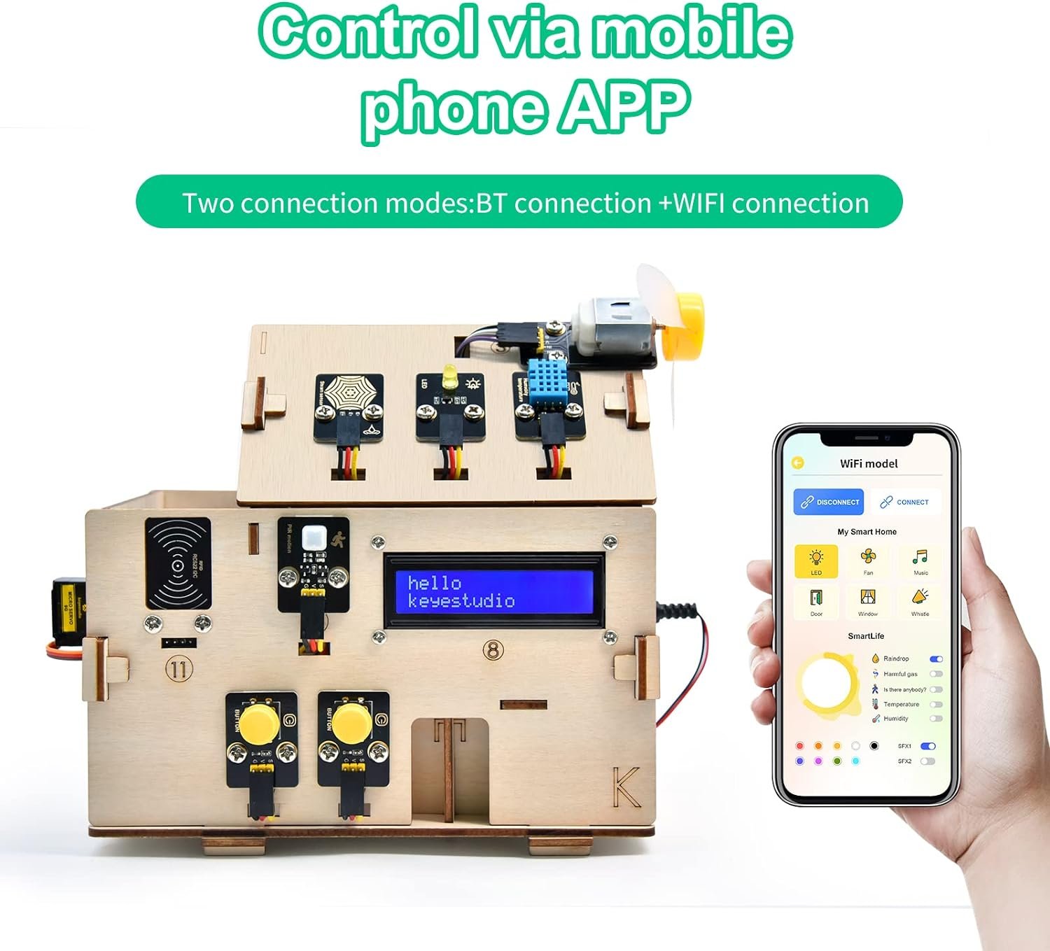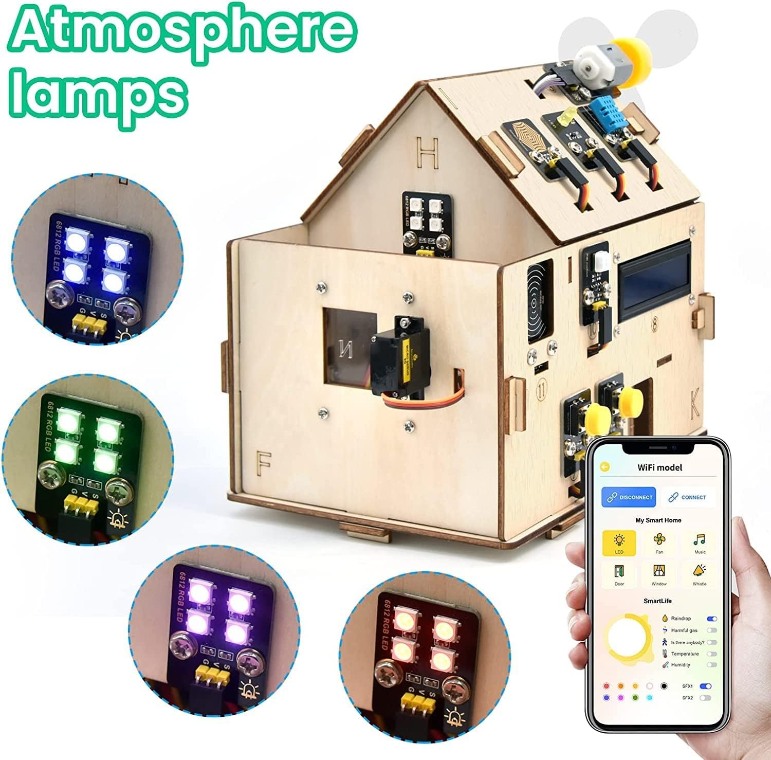 【Multifunctional】Smart home includes functions such as PIR Motion Sensor/Dangerous Gas Alarm/LED module/Temperature and Humidity Sensor/Morse Code .All kinds of electrical equipment can be controlled by mobile phone, control lights, fans, air conditioning and so on.
