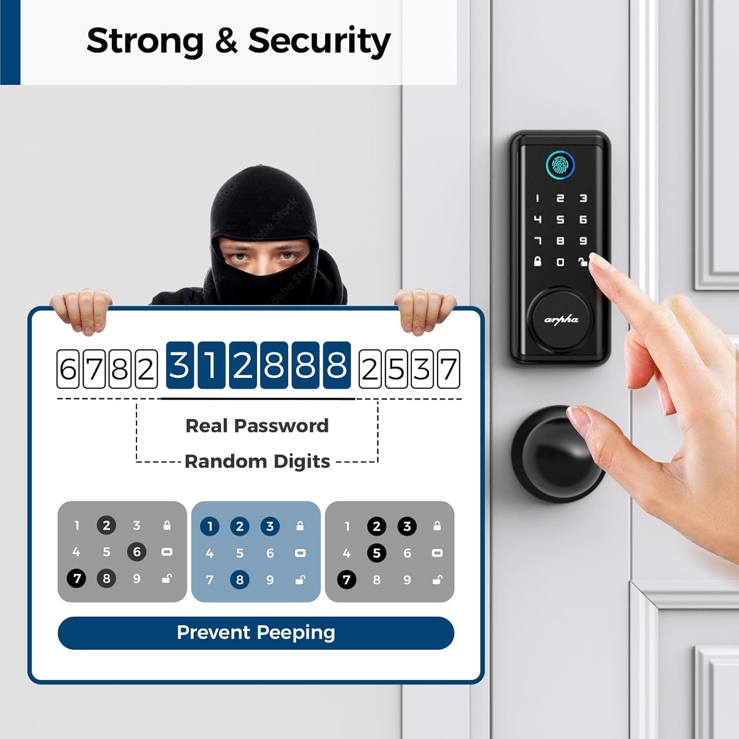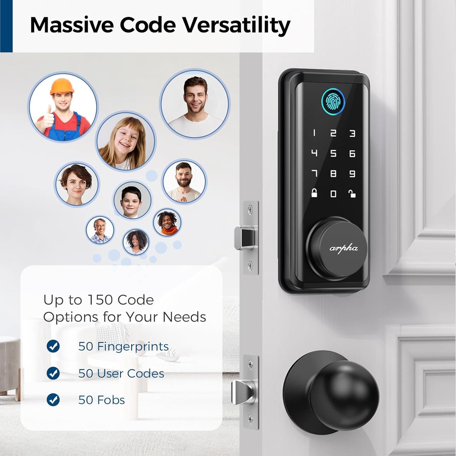 🔒 6-in-1 Unlock: Arpha keyless entry door lock could be unlocked via APP Access, Fingerprint Touch ID, Keypad Code, Card Fob, Traditional Key Unlock. Never get locked out again with multiple secure ways to access your home.