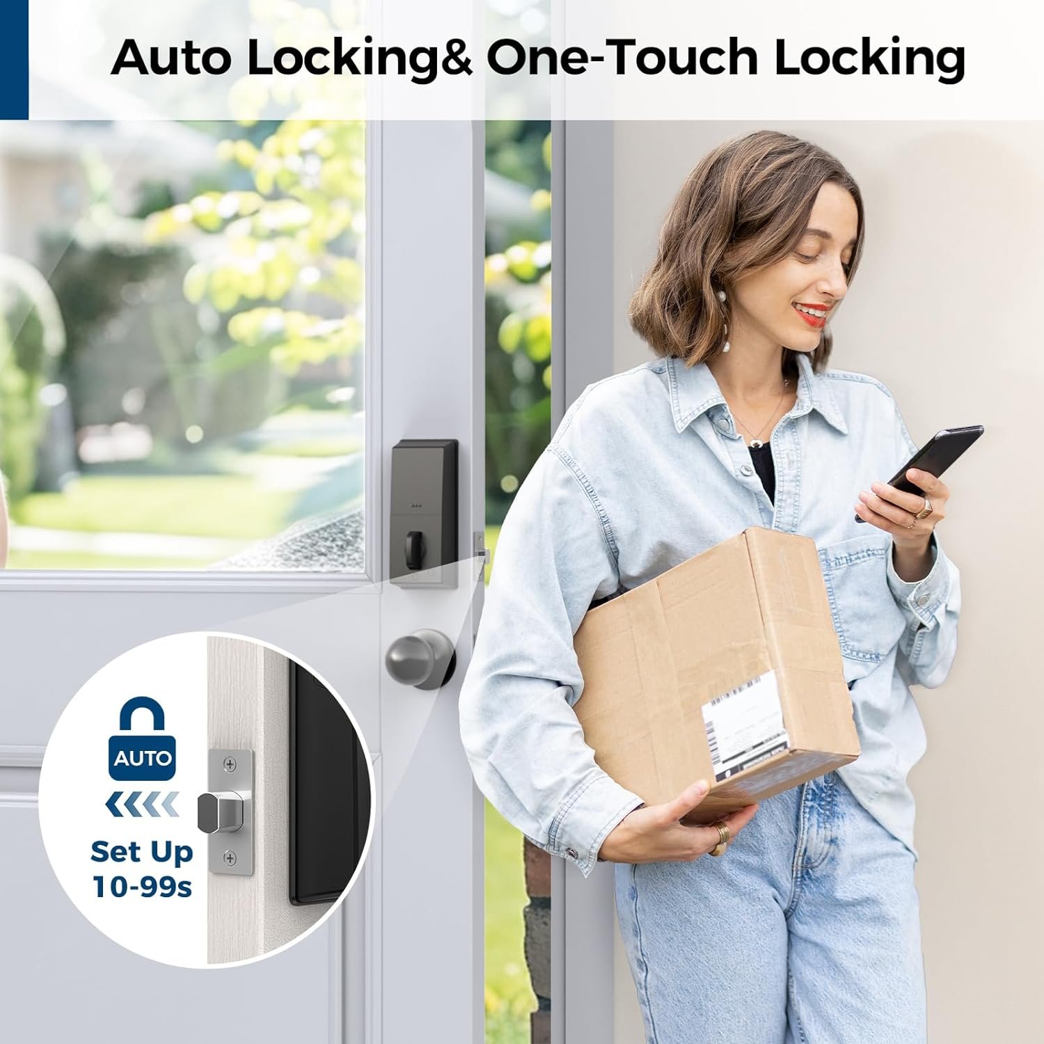 🏃♂️One-Touch Lock and Auto Lock: One-touch lock just hold down the 🔓️/🔐 key for 2 seconds.The keypad door lock also comes with a ‘Smart door locking’ feature that automatically locks the door after 10 seconds to 30 minutes. Extremely convenient for those with busy lives-simply close your door and it will auto lock behind you.