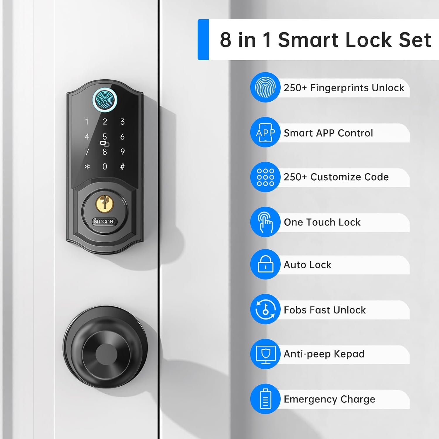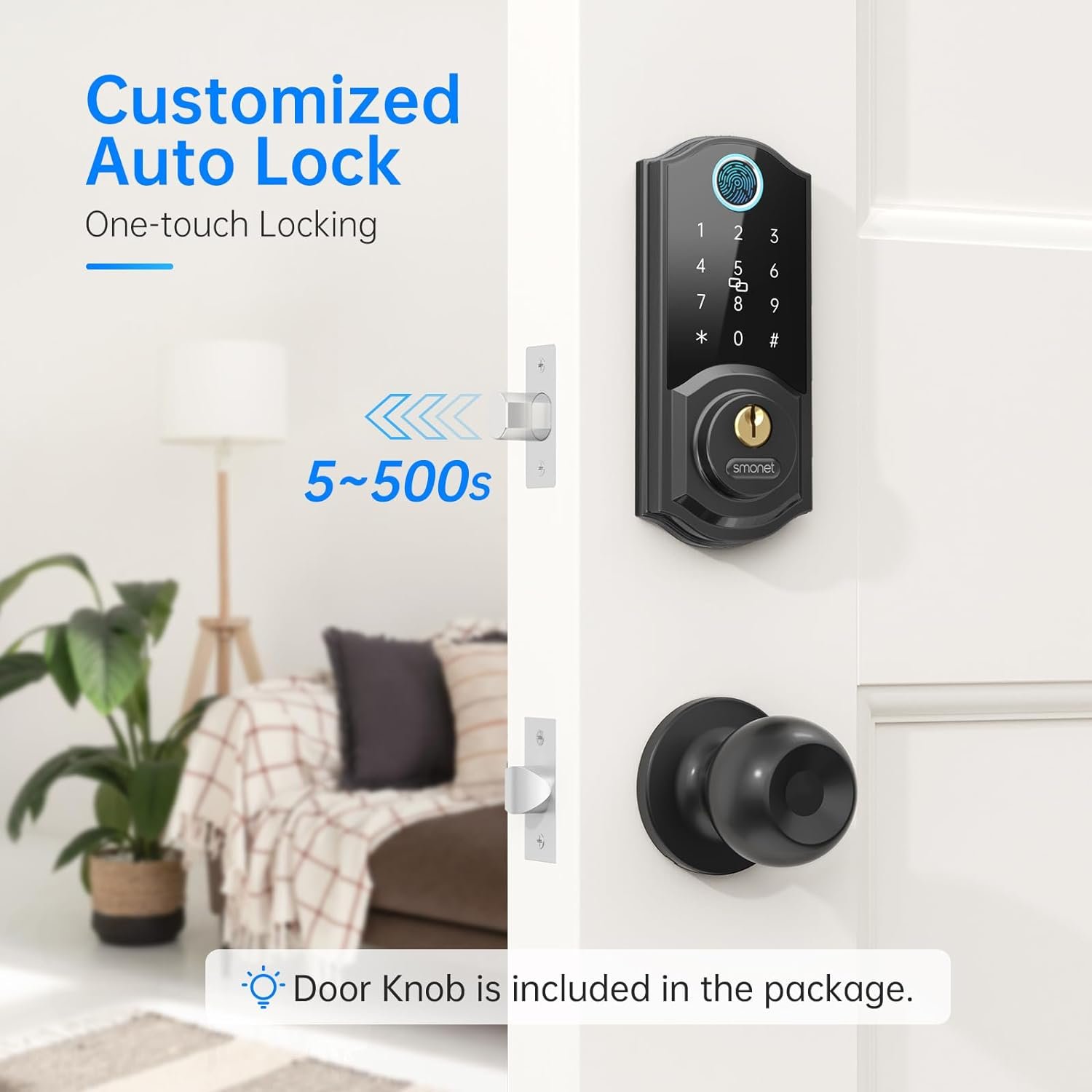 10 in 1 Secure Keyless Lock Set: The front door lock with knob set offers fingerprint / free app / passcode / key fobs / mechanical keys / auto lock / E-Key / knob set / remote control /Smart voice control (requires extra hub).With all these options, you never have to worry about losing your keys and getting locked out. Simply choose the best unlocking method that suits your needs.